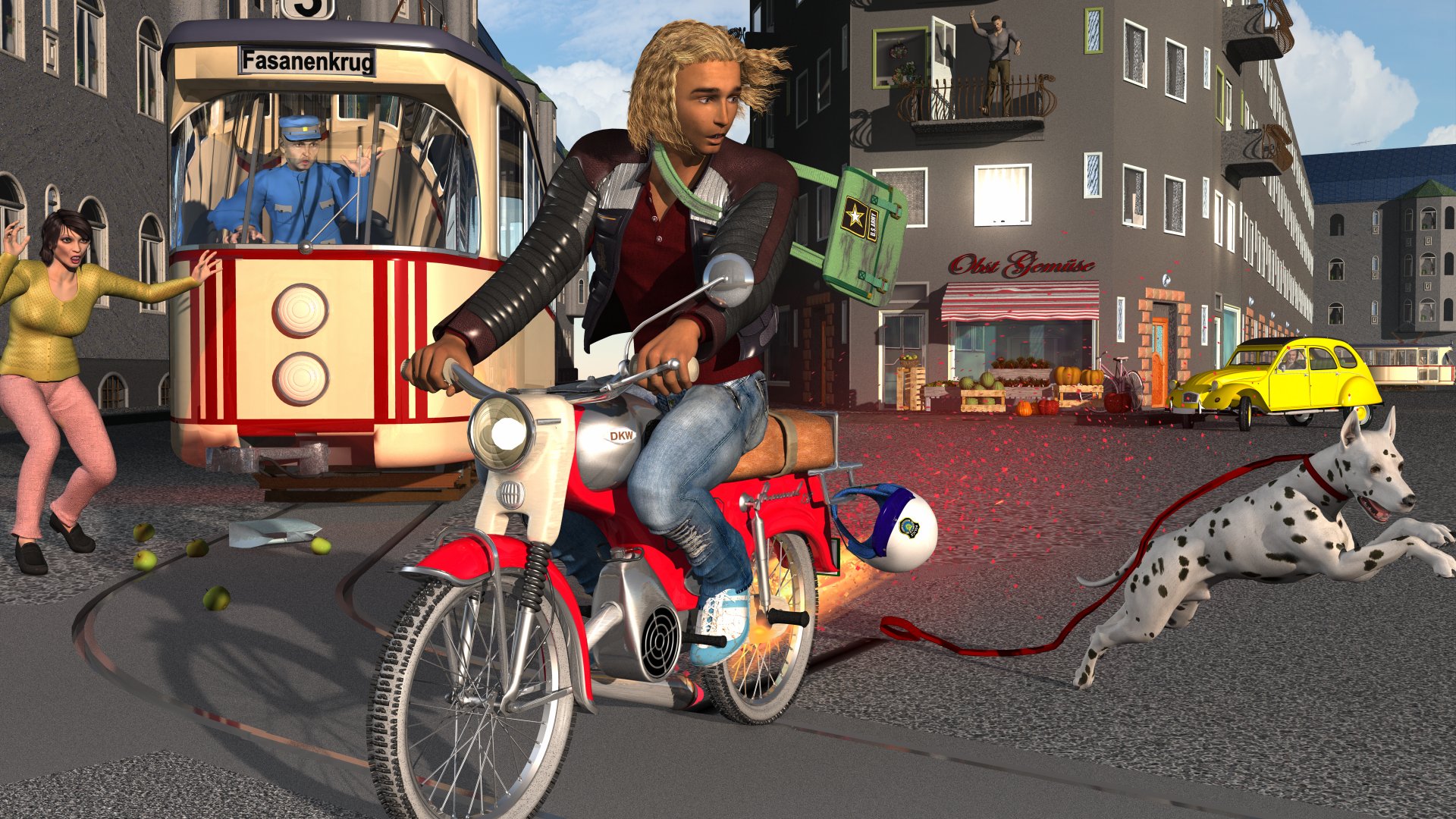 Häuser, Straßenbahn und die HUMMEL DKW sind eigene Konstruktionen. Die Straßenbahn habe ich übrigens in SKETCHUP gemodelt, Moped und Häuser in CARRARA und HEXAGON.