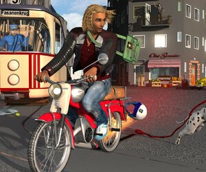 So nennt sich eine große Straßenkreuzung in Hannover-Linden. Personen, Kleidung und Hund sind von DAZ, die Auto-Ente ist ebenfalls Kaufware. Der Polizeihelm ist Freeware von RENDEROSITY.