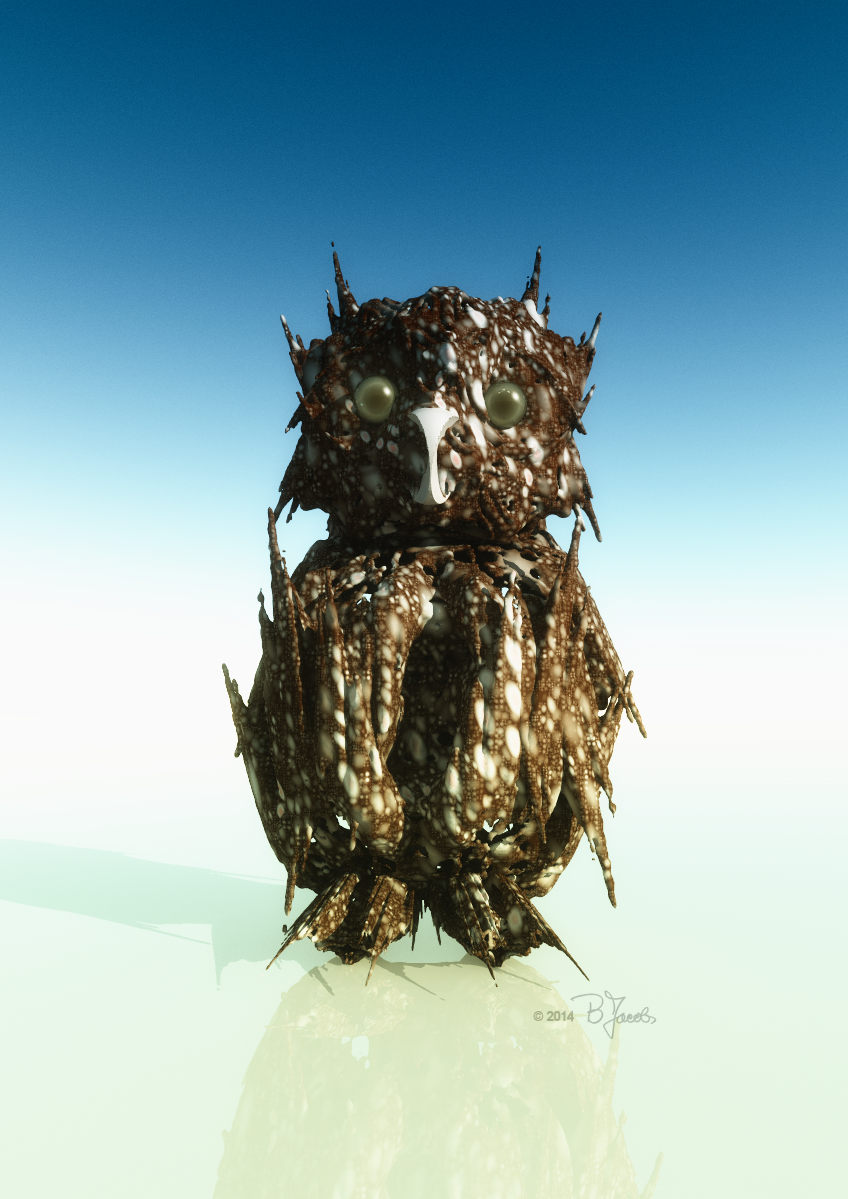 Er ist ganz und gar aus ein und demselben, duplizierten, gedrehten und gezogenen Incendia Fraktal gemacht und erhielt in Vue modelliert seine Augen und den Schnabel