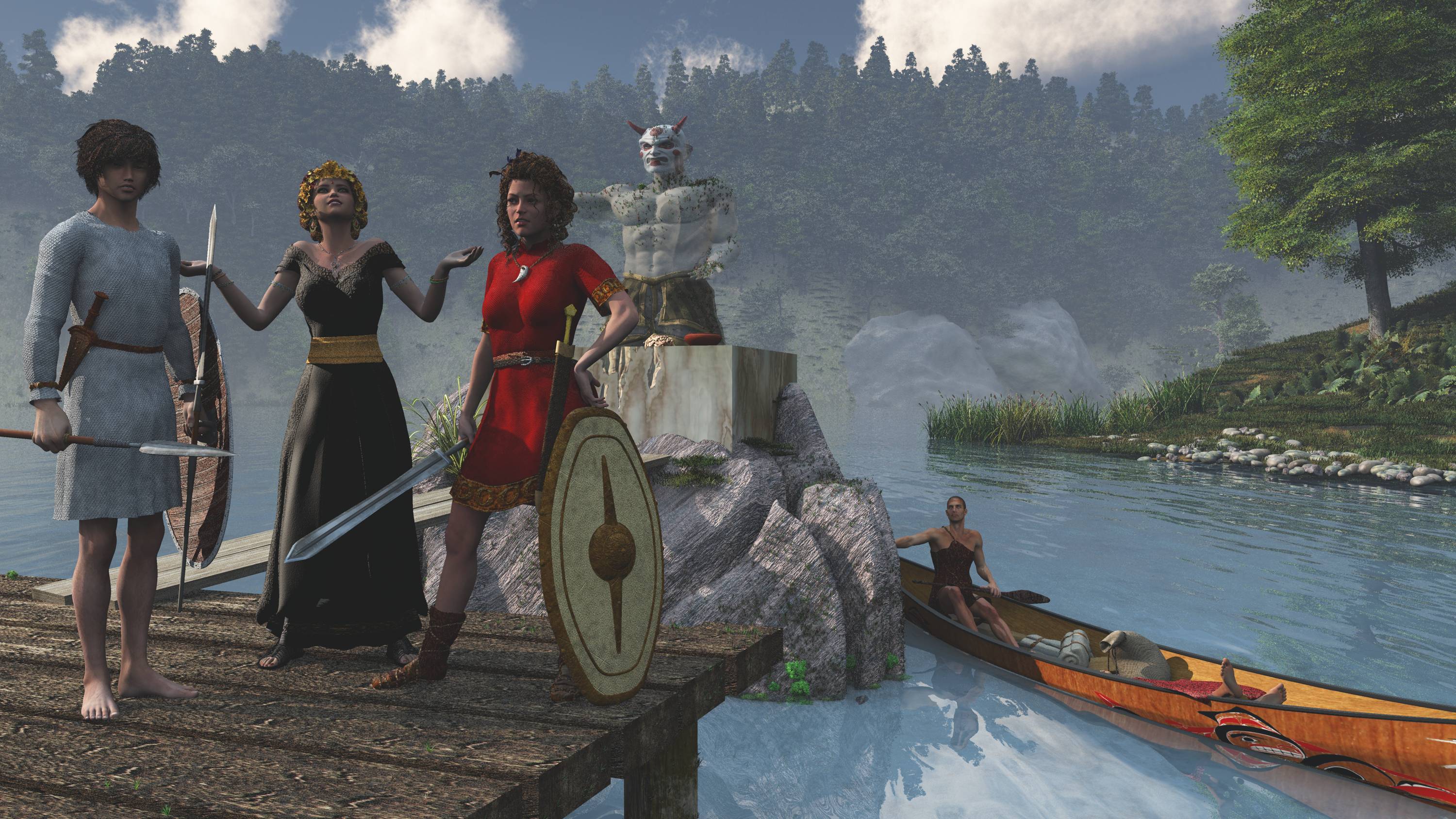 Skaliert ist im Bild nichts, ich benutze nur reale Entfernungen, alles im gleichen Maßstab. D.h. das hintere Ufer ist sehr weit entfernt und daher so klein. Es soll sozusagen nur nebensächlicher Hintergrund sein. Aber du hast völlig recht, die Figuren, auch wenn sie die Hauptsache sein sollen, wirken zu massiv und stören das Bild irgendwie. Ich werde da mal rumprobieren.