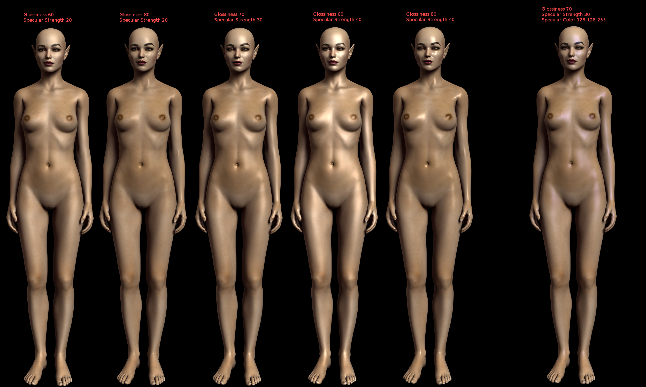 Wie du siehst, glänzen sie ganz unterschiedlich - die erste könnte als ein bisschen verschwitzt durchgehen, die in der Mitte ist schon ziemlich ölig, und die mit Glossiness 80 und Specluar Strength 40 sieht aus wie aus Plastik.