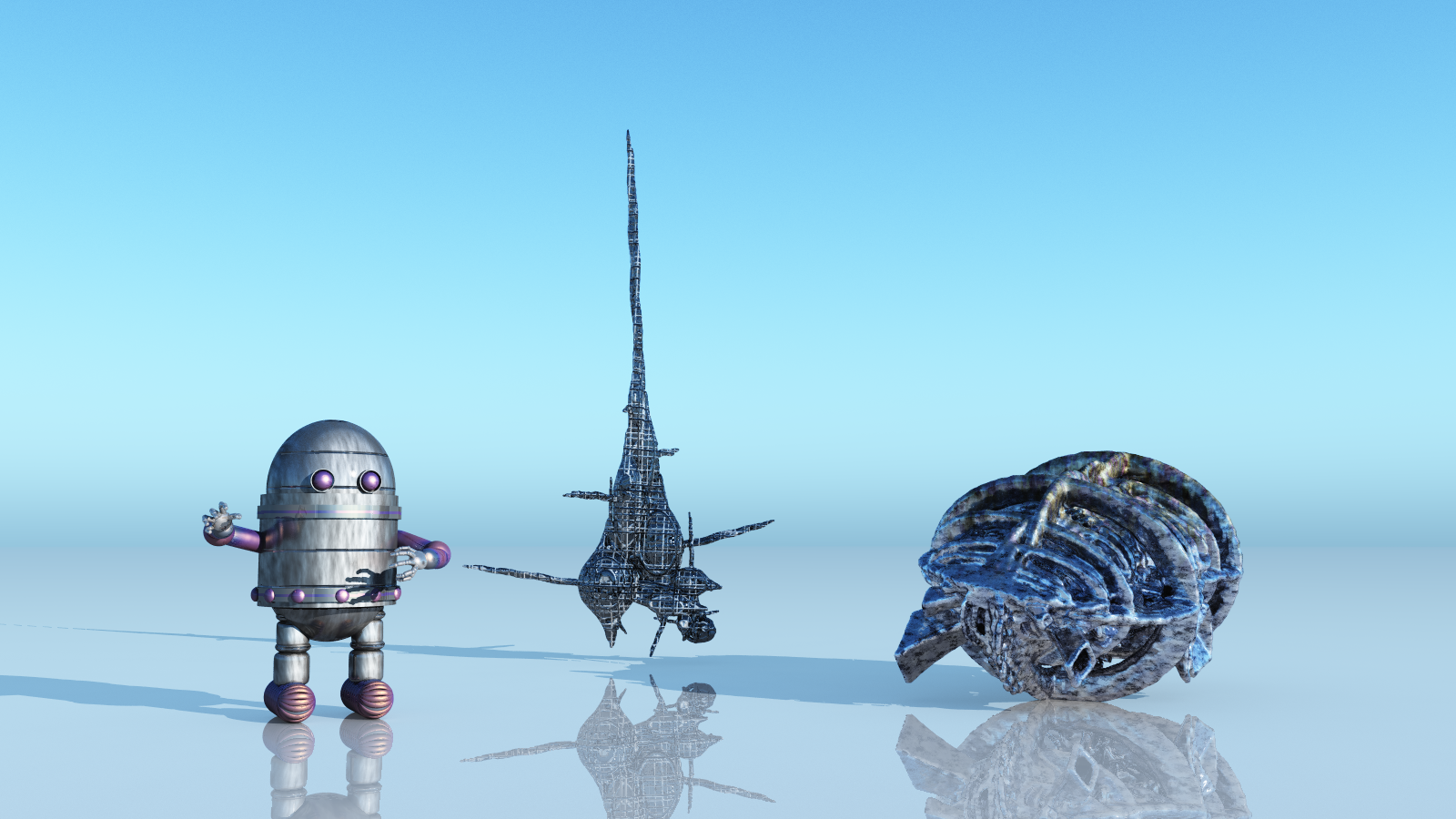 und hier noch angehängt die gemodelten Zutaten, zwei Incendia Fraktale und ein mal weiland von mir in Vue geschaffener kleiner Robot ![]()