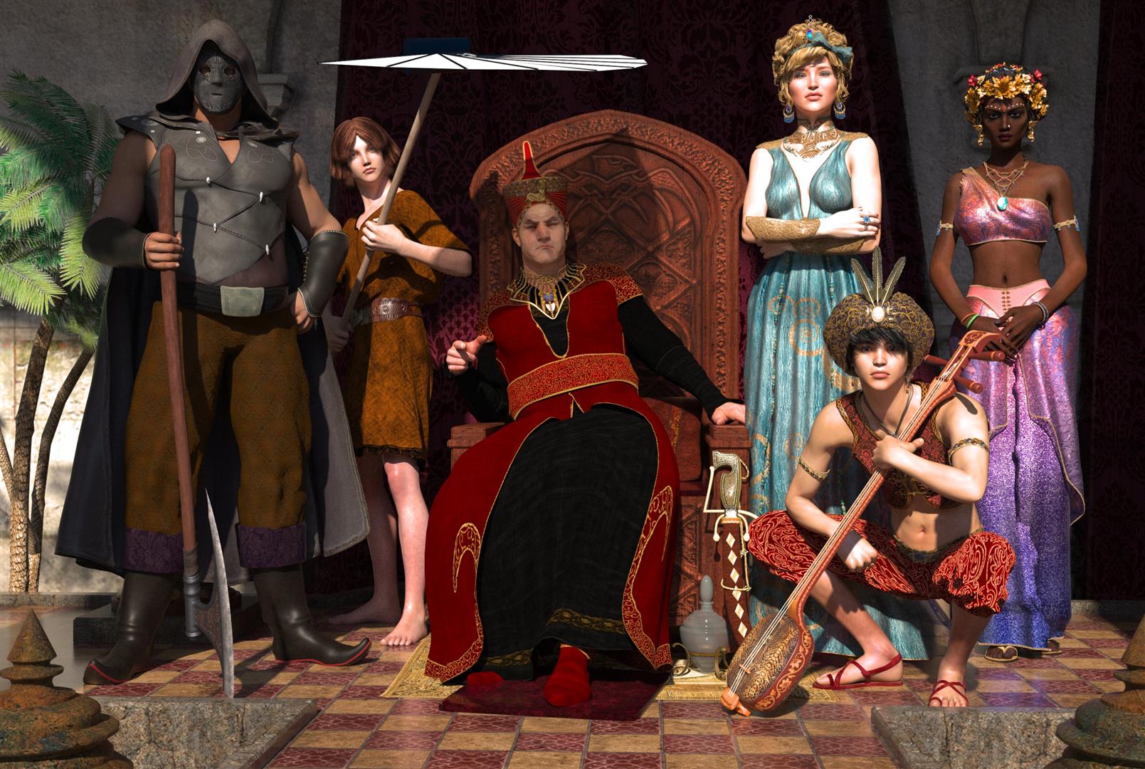 Ich habe diesen Thron gekauft und wollte mal ein paar Figuren ohne Kampfszene aufstellen. ;) Alles sicher nette Menschen. Das Original .png-Bild hat 2816 x 1890 Pixel und über 8 MB, daher verliert es einiges. Es hat jetzt seit 14 Stunden gerendert und erst ca. 370 S/p (Reality-Verwender können damit was anfangen), ich verliere etwas die Geduld. Lichteinstellungen sind Sonne, 100 ISO, Shutter 1/125, f-stop 17 und Gamma 1. Das Bild ist nicht nachbearbeitet, also nicht so richtig final, mal schauen, ob ich das noch mache.