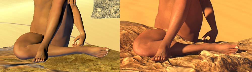 Wenn ich eine Figur auf einen Felsen plaziere - sieht erstmal alles gut aus. Nur, da der Felsen als Displacement gebaut ist geht er teilweise beim rendern durch die Figur. Wie kann ich das verhindern, bzw wie kann ich das bereits beim Bildaufbau sehen?