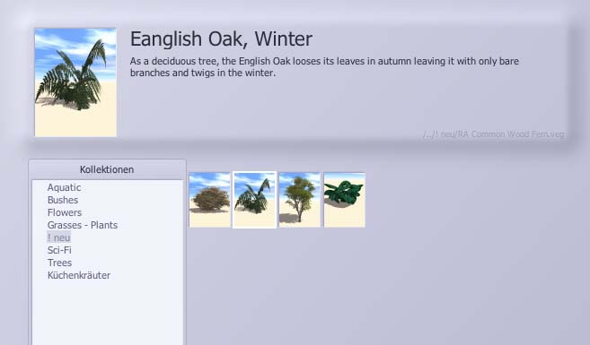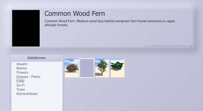 Mein Versuch, in der .veg-Datei mit einem Text-Editor die „Eanglish Oak, Winter“ durch „Waldfarn“ zu ersetzen, scheiterte kläglich ( siehe Bild 3 :( statt der von mir eingegebenen deutschen Bezeichnung erscheint jetzt in der Library zwar immerhin der korrekte Original-Name inklusive passendem Kommentar in englischer Sprache, aber der Thumbnail fehlt und der Versuch das Objekt in die Szene zu laden wird von Vue mit der gehässigen Bemerkung kommentiert, daß es die Datei nicht lesen könne.