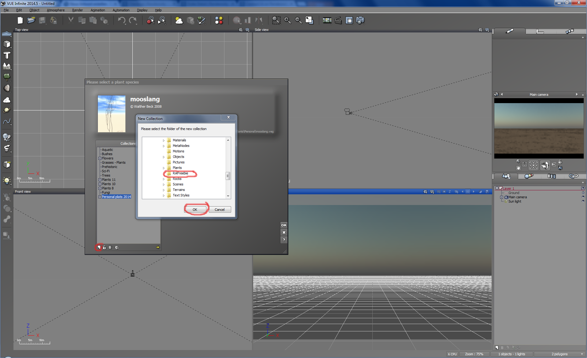Pflanzenladefeld öffnen, unten links auf den Knopf Neue Kollektion (Blatt mit geknickter Ecke), dann geht ein Fenster auf, den neu benannten Ordner auf Deinem Computer suchen und auswählen, ok drücken. Das dann erscheinende Fenster lässt dich den Ordner noch mal umbenennen, wenn Du willst, ansonsten einfach okay drücken und siehe da, da ist der Ordner.