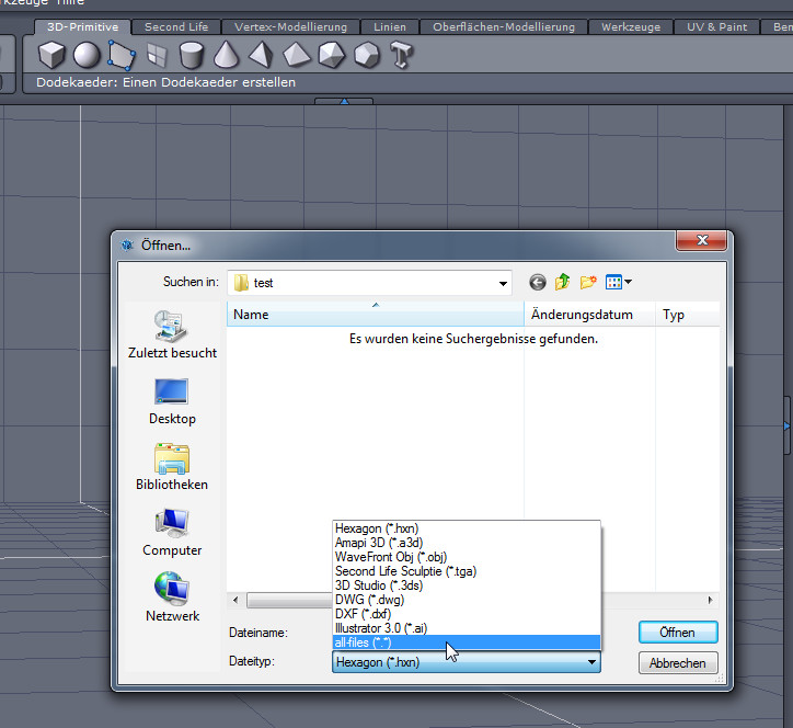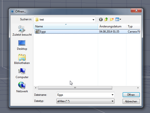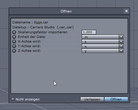 Egal wie, auch wenn du nun Carrara selber nicht hast, gibt es hier im Forum bestimmt einige freundliche Member, die dir das kurz in dein gewünschtes Format konvertieren, sofern es möglich ist.Hexagon kann übrigens auch *.car einlesen, auch wenn es als Endung nicht explizit angegeben ist (All Files *.*).