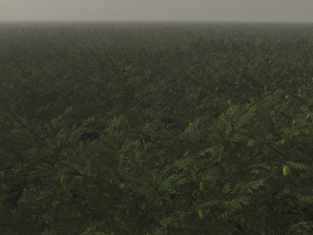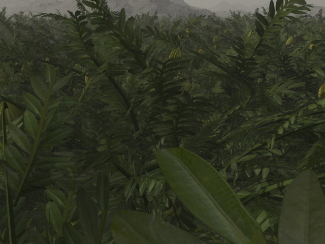 Allerdings war beim Rendern einfach überhaupt kein Unterschied zum ersten Bild zu erkennen. Zuerst wusste ich nicht, woran es lag, bis ich an den Größenschrauben für das Starterobjekt drehte und die Pflanze mal so richtig groß einstellte. Da bekam ich immerhin einen dichten Dschungel (Datei "Test 02d"), so dass schon einmal verifiziert war, dass Terragen die Pflanze tatsächlich lesen konnte.