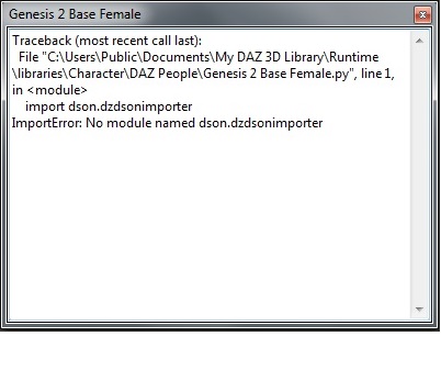 File "C:\Users\Public\Documents\My DAZ 3D Library\Runtime\libraries\Character\DAZ People\Genesis.py", line 1, in <module>