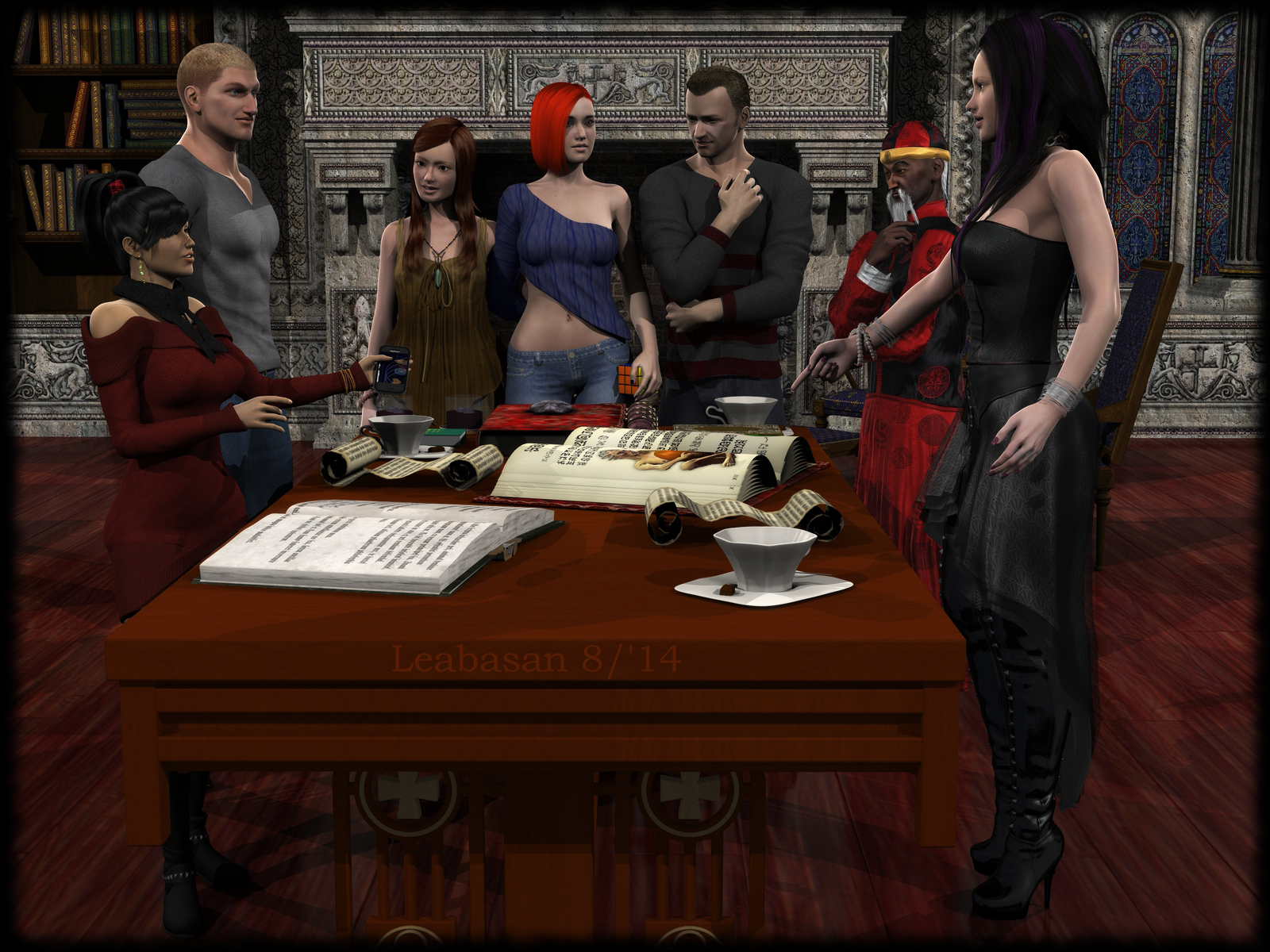 Sehr schön positioniert, die Materialien kommen richtig rüber, bloß beim Tisch habe ich ein etwas komisches Gefühl. Ein paar Fragen: ist die Kleidung des alten Chinesen die von Mec4D? Woher stammen die Armschmuckteile der Dame ganz rechts? Finde ich gut. Ist Herzogin ein Beruf wie Kellnerin? Was für ein Rollenspiel-Universum ist das? Die Kombination aus relativ normaler Alltagskleidung plus Magie fällt mir auf. Was für eine Art von Magie ist das, Feuerbälle werfen oder subtiler? (Pssst: ehrlich gesagt, Magie gibt es gar nicht!) Wieso arbeiten die Charaktere als Gruppe zusammen? Ist das ein Hobby-Treff oder retten sie professionell die Welt? Warum haben die Männer so langweilige Klamotten an? Wer hat was mit wem? ;)