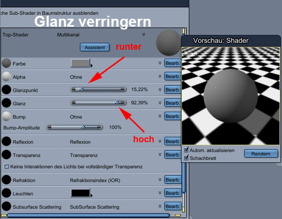 Achja, wegen dem Glanz, den kannst du ganz einfach im Textureditor umstellen...