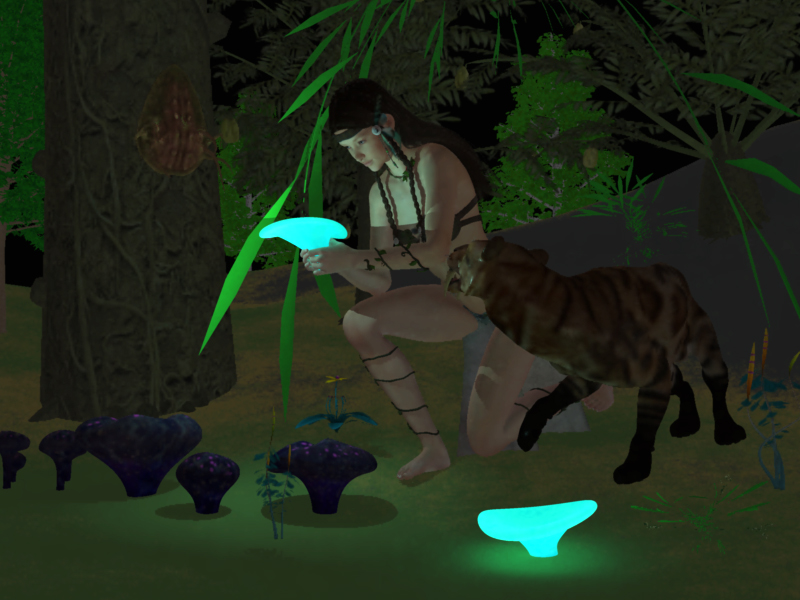 Die Figur ist Viktoria 6. Bei den drei größeren Bäumen handelt es sich um Modelle von XFrog (Alethopteris), die Bäume im Hintergrund sind mit Carrara-Bordmitteln erstellt. Die Pilze entstammen der "Alien Plants"-Sammung von Petipet (DAZ). Vom Smilodon habe ich zwei Modelle, wobei das schönere grundsätzlich das aus dem "Big Cats 2"-Paket von DAZ ist. Leider hat die DAZ-Katze in Carrara nur leere Augen (ohne Textur) und würde in dieser Zusammenstellung auch die Systemressourcen der Szene sprengen. Für die Katze im Bild habe ich das Modell von DinoRaul (Renderosity.com) ausprobiert. Diese Katze hat zwar Augen, aber leider trägt das Fell einen so heftigen Glanz, dass das Tier unter direkter Beleuchtung aussieht wie aus Plastik. Diesen Glanz habe ich noch nicht wegbekommen.