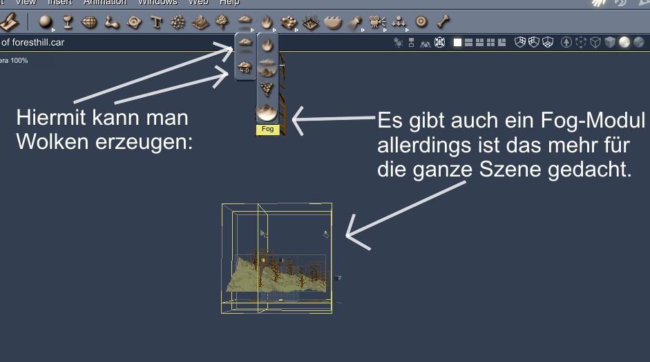 Für Bodennebel würde ich mit Wolken experimentieren. Diese Wolken sieht man allerdings erst beim Rendern, im Assemble-Room hat man nur den Container der Wolke. Kannst aber mit dem Ausschnittrender (Kamerasymbol am linken Rand anklicken und Render-Bereich mit Auswahlrahmen auswählen) auch im Assemble-Room immer ganz schnell eine Vorschau bekommen.