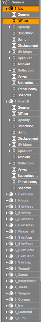 Klappe den kleinen Pfeil von Lip zu, dann wähle alle Surfaces aus (Klick auf den Eintrag "Genesis" oder selektive Auswahl - unter Windows nimmt man die Strg-Taste, beim Mac weiß ich nicht), suche dann den Eintrag für die Diffuse Color im Shader selbst und bearbeite sie da.