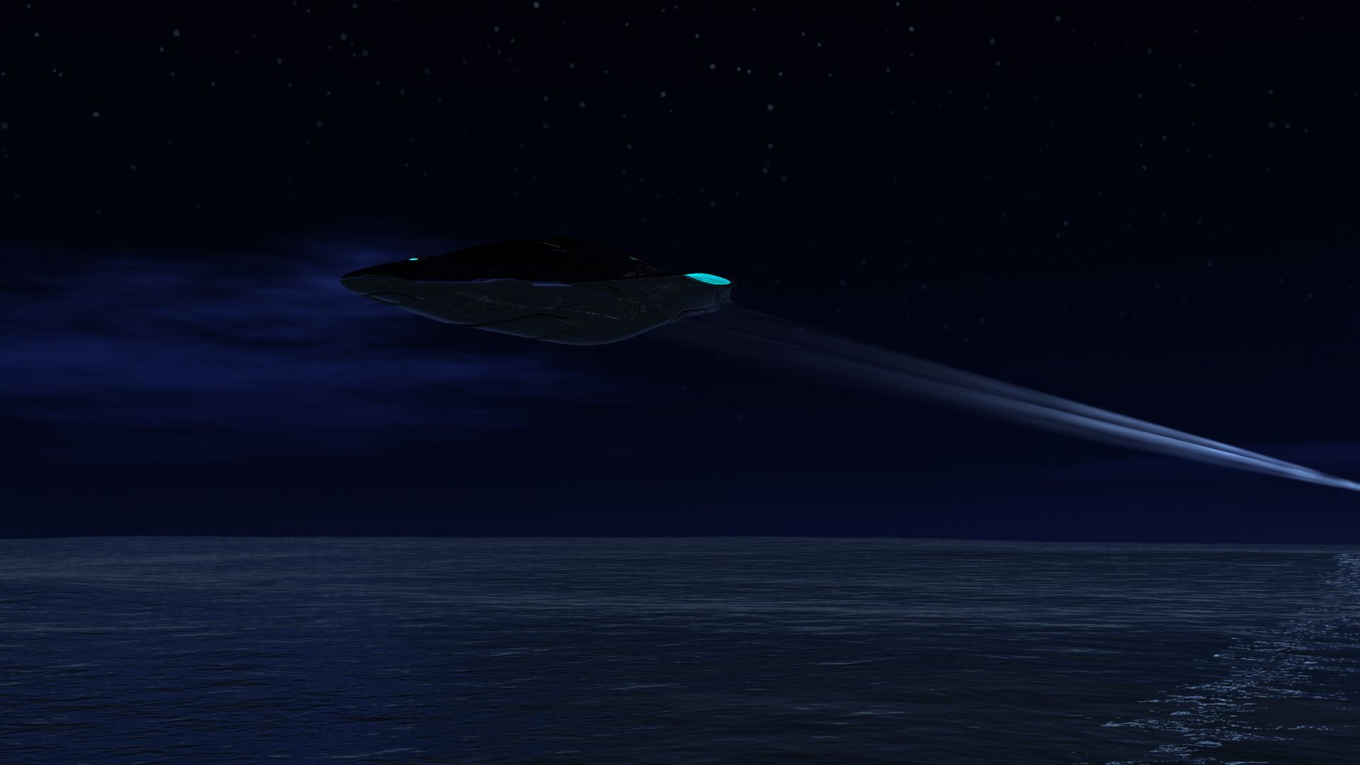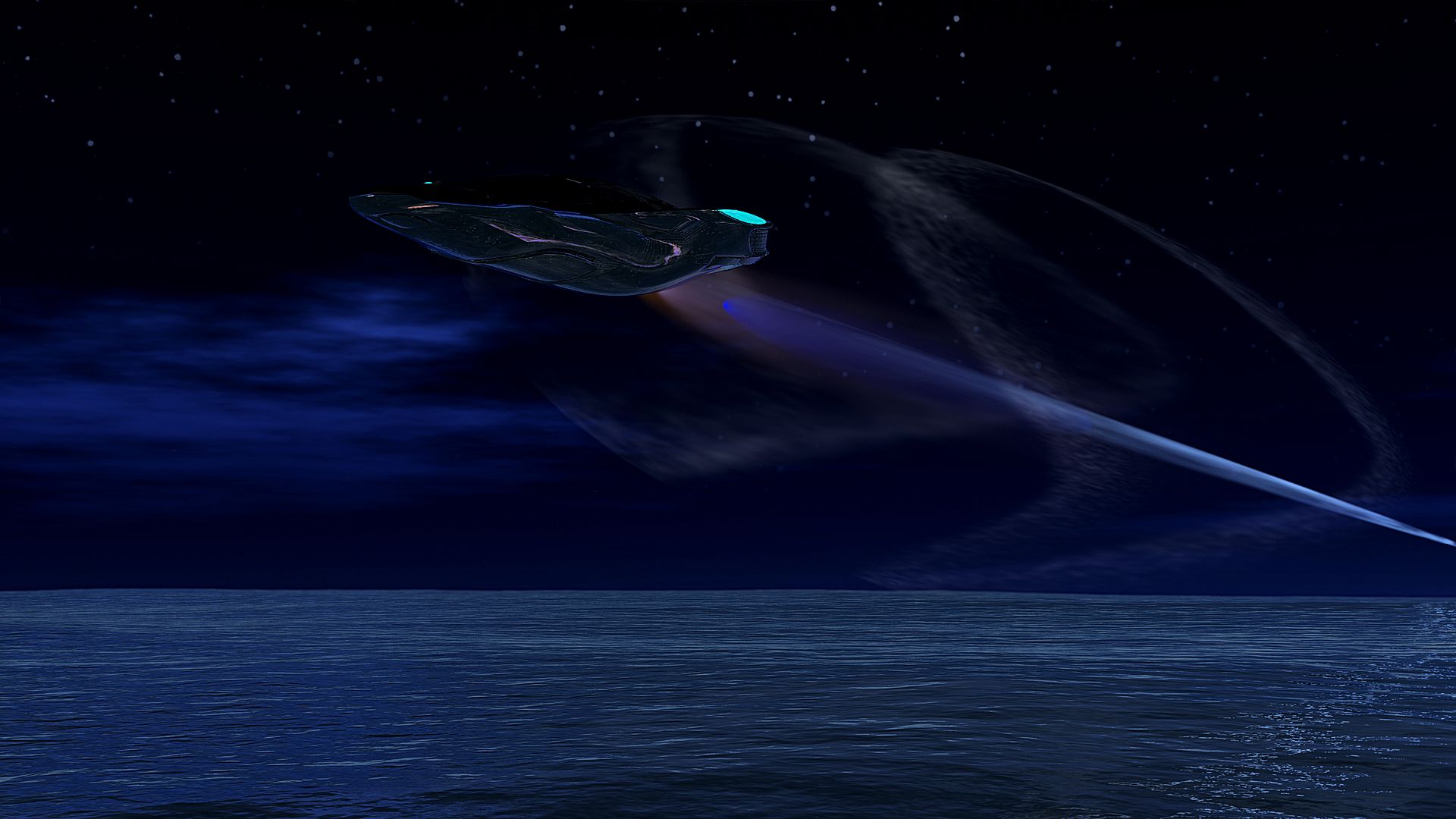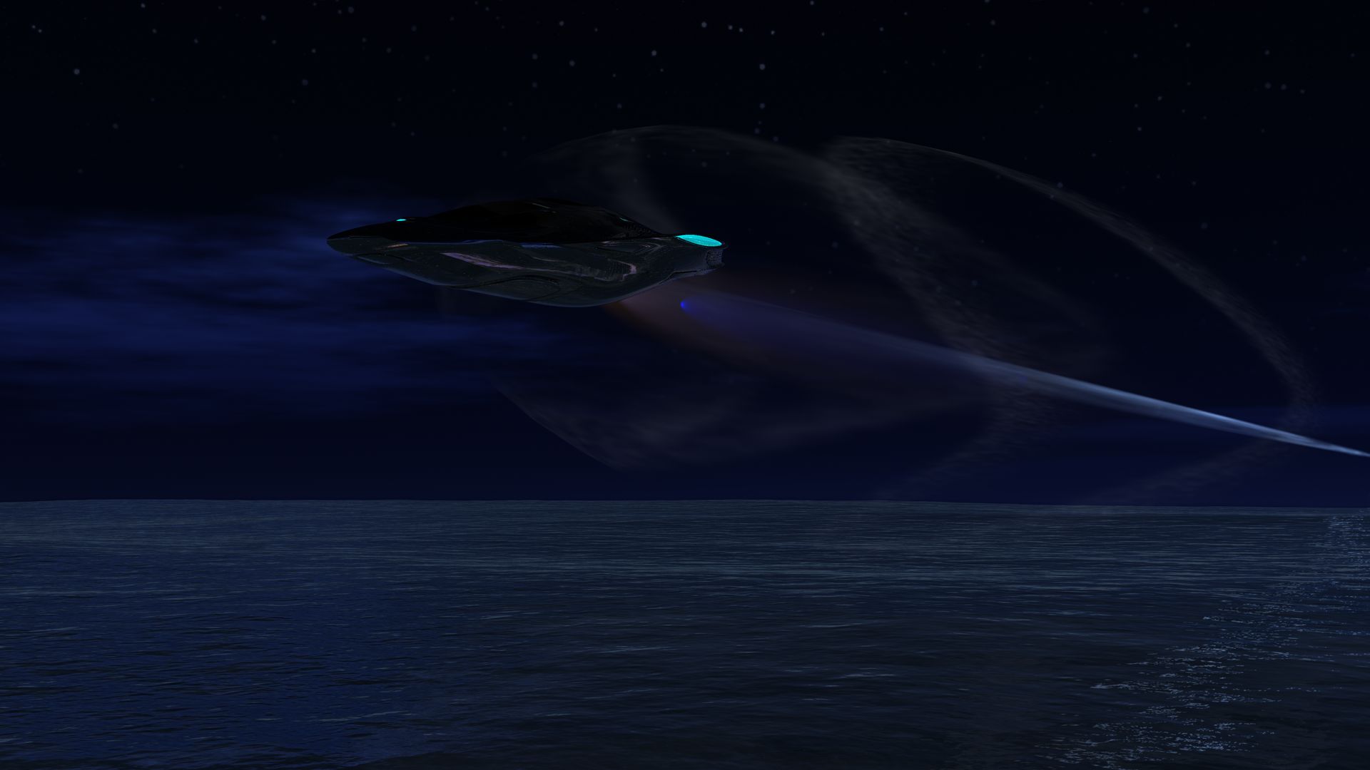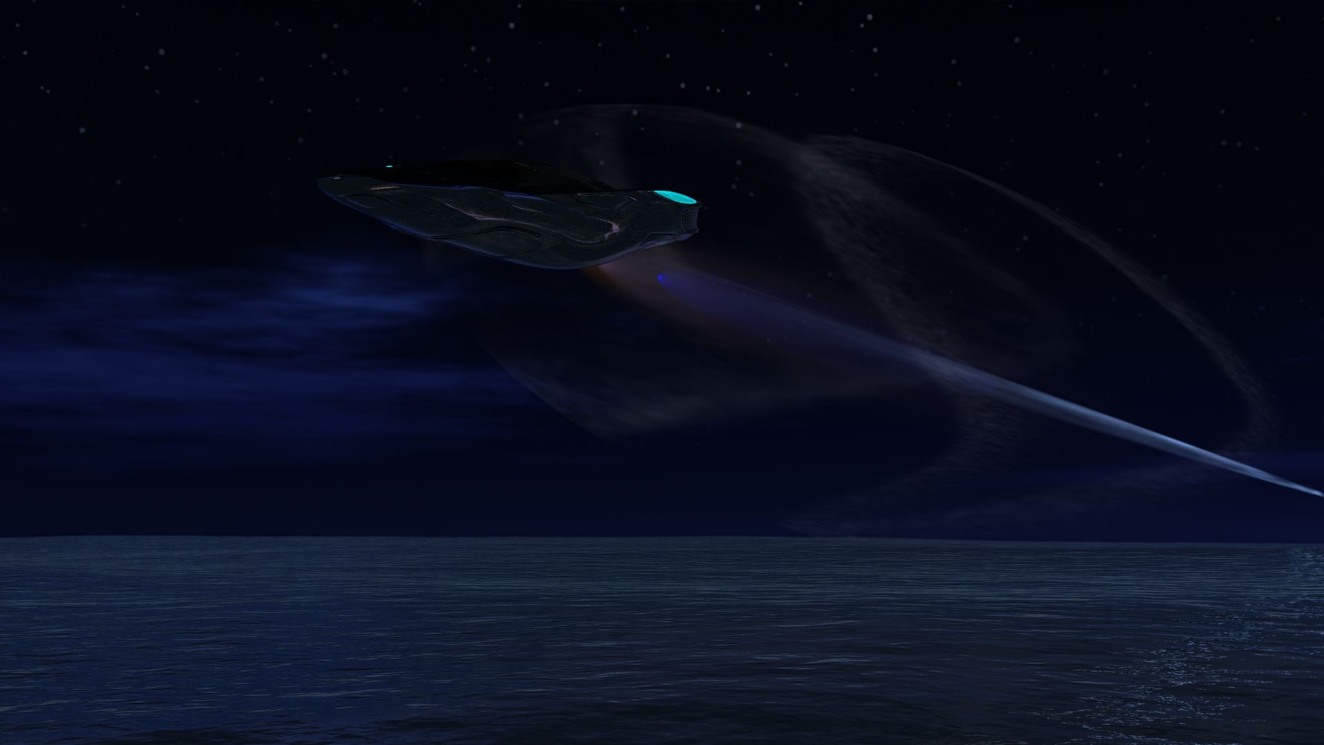 Der Render entstand durch Zufall, beim herumexperimentieren mit selbst erstellten Abgasstrahlen bzw. Kondensstreifen. Ansehnlich ist das Bild nur im Dunkeln und auch nur, weil sich der Nachthimmel (BWC Skydome) auf dem Ozean (Ocean wide / DAZ) spiegelt, welcher wiederum an der Unterseite des Jets (stunt glyder / TF3DM) reflektiert wird. Jet Textur und Abgasstrahl sind selbst gemacht. Im Postwork habe ich nur der Ozean etwas abgedunkelt.