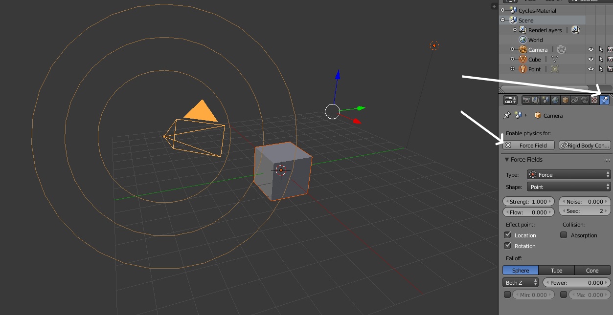 ein Screenshot wäre hilfreich, da ich beim besten Willen nichts finde womit man in Blender 3 weiße Kreise um die Kamera macht.Das einzige was ich gefunden habe ist Forcefields unter Physics. Das macht zumindest drei Kreise um die Kamera. Guckst du Dateianhang. Wenn Du auf das X (siehe kleiner Pfeil) bei ForceField drückst, ist das wieder weg.