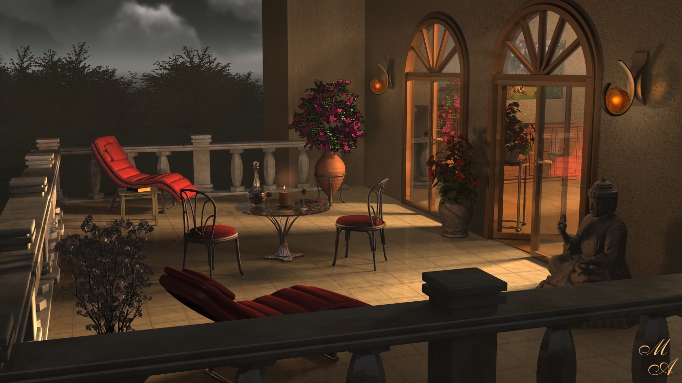 Terrasse: Gebaut und gerendert in Bryce. Kein Postwork.