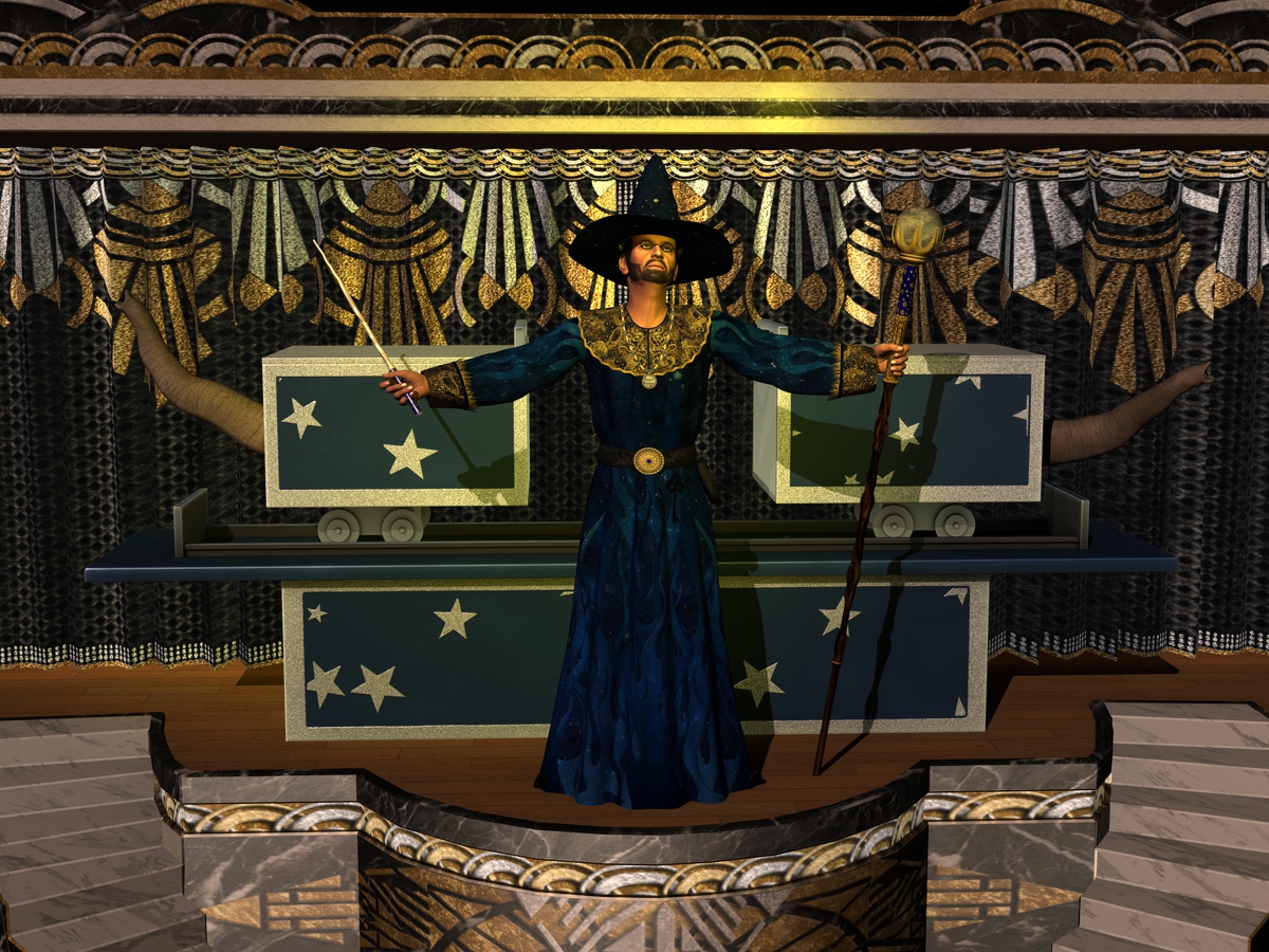 Nachdem er den Elefanten mit einem Zauberspruch auf der Bühne zerteilt hat, bemerkt er noch nicht dass ihm ein peinlicher Fehler unterlaufen ist ...
