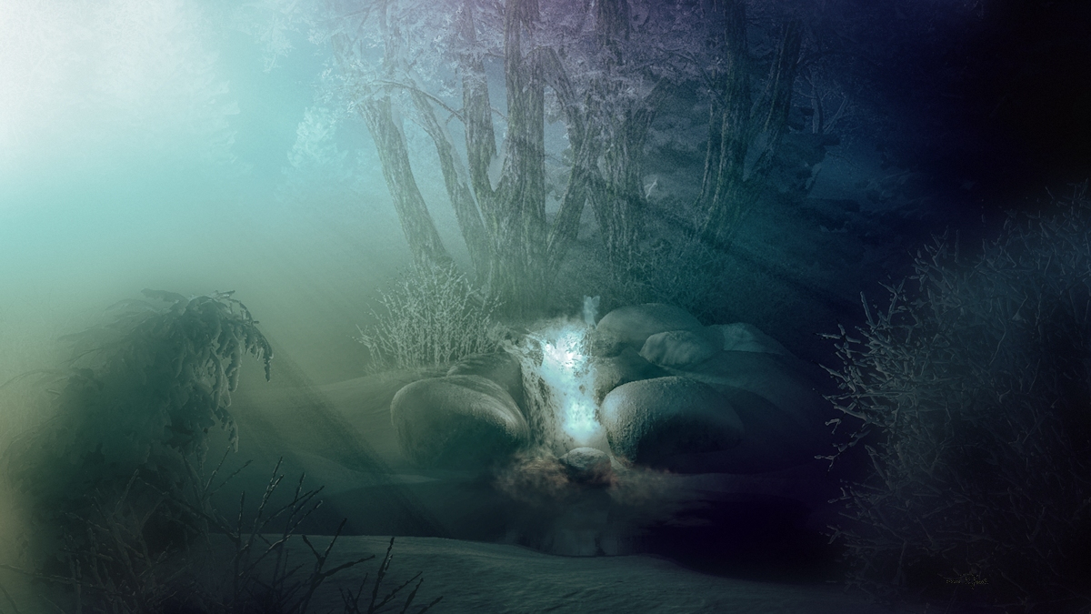 War hier nicht der Fall, um es gleich dazu zu sagen, sondern den Titel hat das Bild bekommen, weil es eben vorwiegend Stimmung transportieren soll, die Stimmung WInter, kalt, Nacht, geheimnisvolles nicht erklärbares Licht, Magie. Es ging mir auch um eine Remake in einer etwas anderen Art von einem meiner ersten Bilder. Und ich liebe Kontraste sowohl im LIcht und Schatten als auch in der Mischung von Realität und Phantasie. Ich weiss nicht, ob viele die Elfe, die am an der leuchtenden Quelle steht überhaupt realisert haben...aber sie war für mich das Tüpfelchen auf dem I ![]()