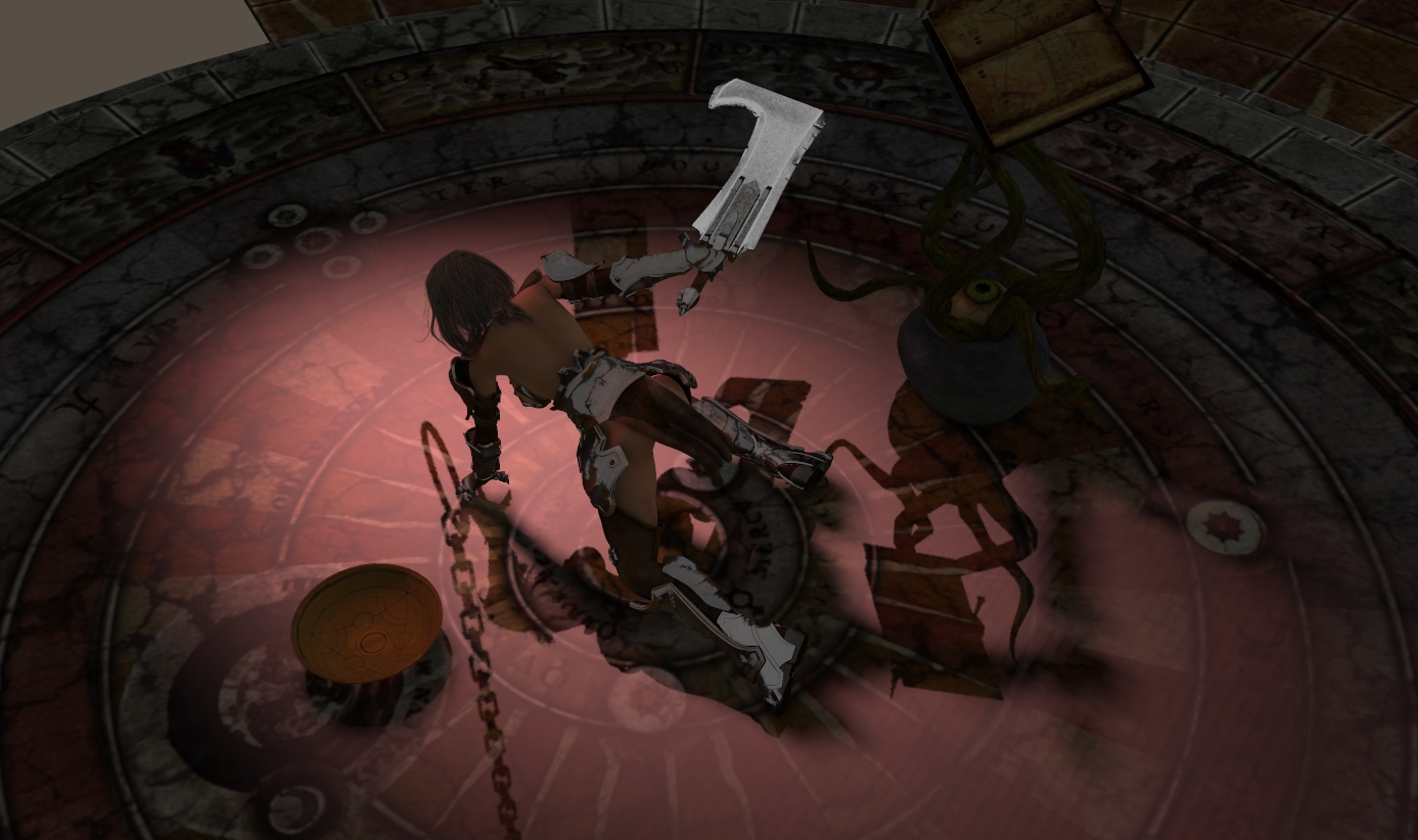 Das Schwert betreffend, habe ich mal einen Testrender angehängt, ohne indirektes Licht. Lediglich mit einem roten Spot und