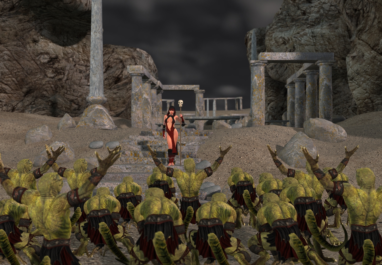 Ich finde die Bildaufteilung nicht gut. Das obere Drittel ist total verloren. Die Priesterin könnte ruhig noch höher stehend rüberkommen. Die Instanzierung der Reptilien fällt nicht auf, das ist ganz gut gelungen. Hochformat wäre auch eine Option.