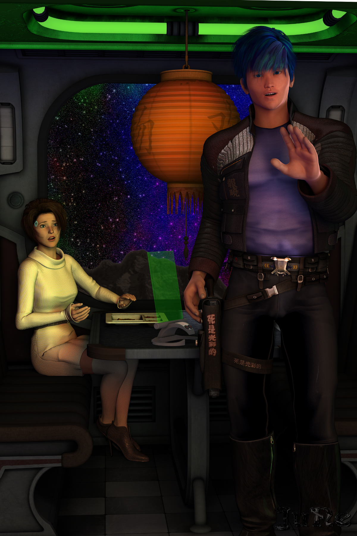 Vorsichtig betrat Megan den Imbiss und sah sich um. Die Gegend gefiel ihr nicht, die Leute gefielen ihr nicht, doch es war mit Sicherheit das Beste, was es auf dieser lausigen Proviantstation gab. Sie hoffte nur, dass Kisho schon da wäre, denn die Blicke der Frachterpiloten an der Bar wollten ihr nicht gefallen.