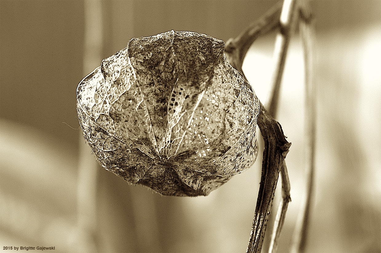 Wieder der Samenstand der Lampionblume. Diesmal nur schlicht und einfach in Sepia-Tönen.