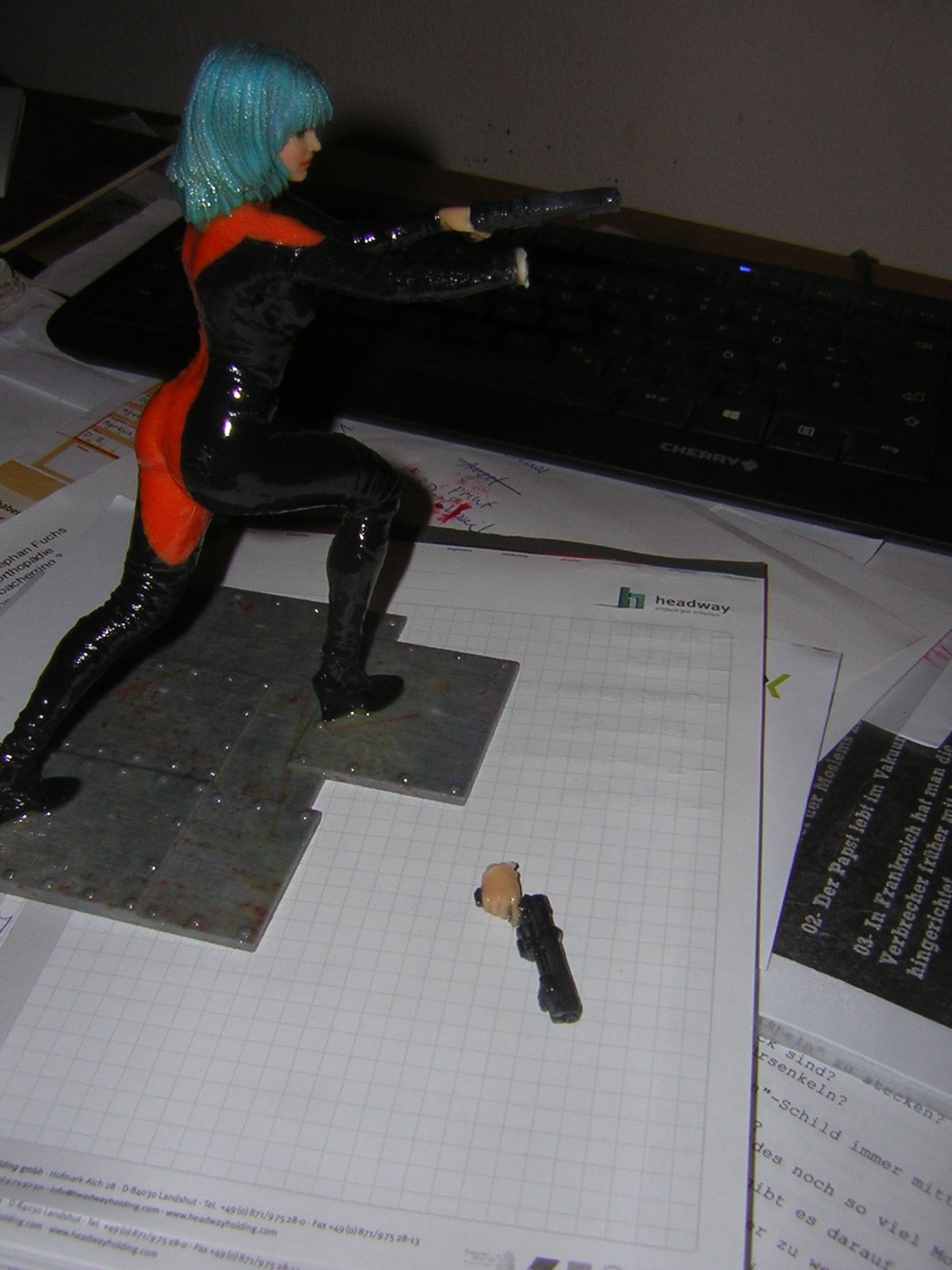 Ich hatte es so in die Hand genommen das ich es gut halten konnte und habe dann etwas in Internet gesurft. So war genug Zeit für den Kleber.Achtung! Sonst klebst Du dich selber an der Figur fest.