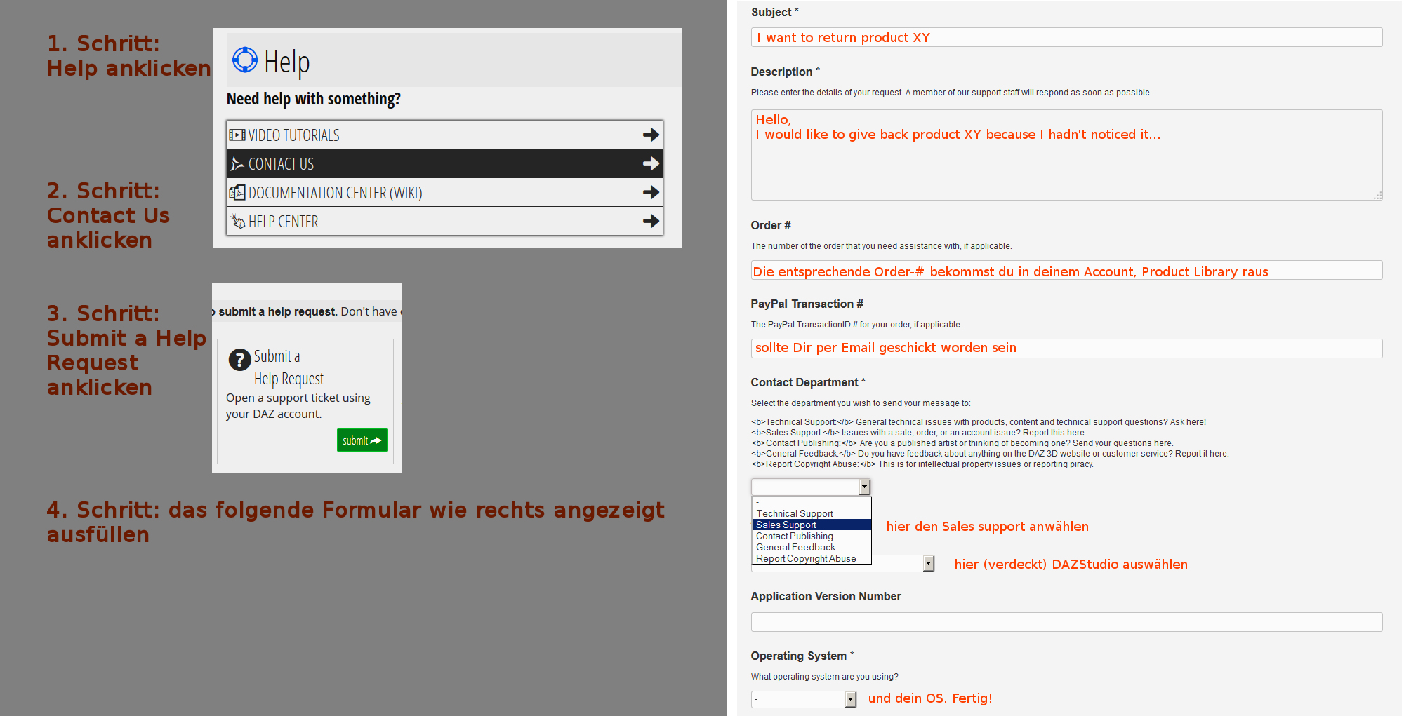 Du gehst ins Help Center und gibst da ein Ticket an den Sales Support ein. Du brauchst nicht begründen, warum du etwas zurückgeben willst, wenn du es innerhalb der letzten 30 Tage gekauft hast, nimmt DAZ es zurück.