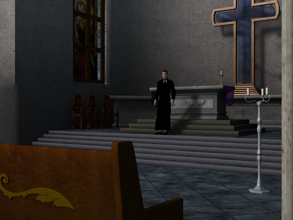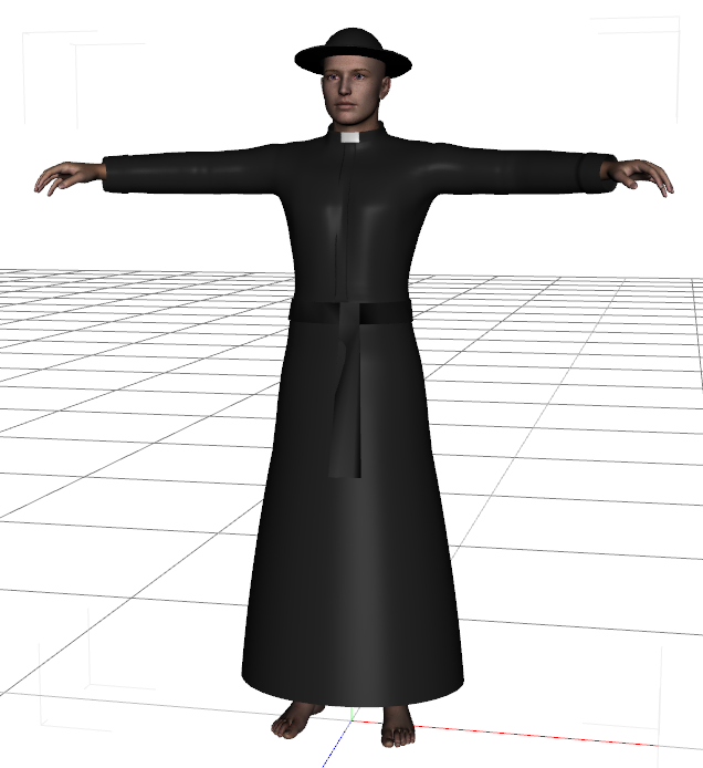Hab ich noch nirgendwo gesehen. Aber was wäre denn, wenn Du einfach den Strick um den Leib weg lässt und ihm zu der weissen Halsbinde diese beiden obligaten weissen "Schleifen"-Enden einfach per modellierter Polys drauf pappst? Das ist doch eigentlich der einzige Unterschied (Die fehlenden Falten im Talar fallen je nach Beleuchtung doch kaum auf...