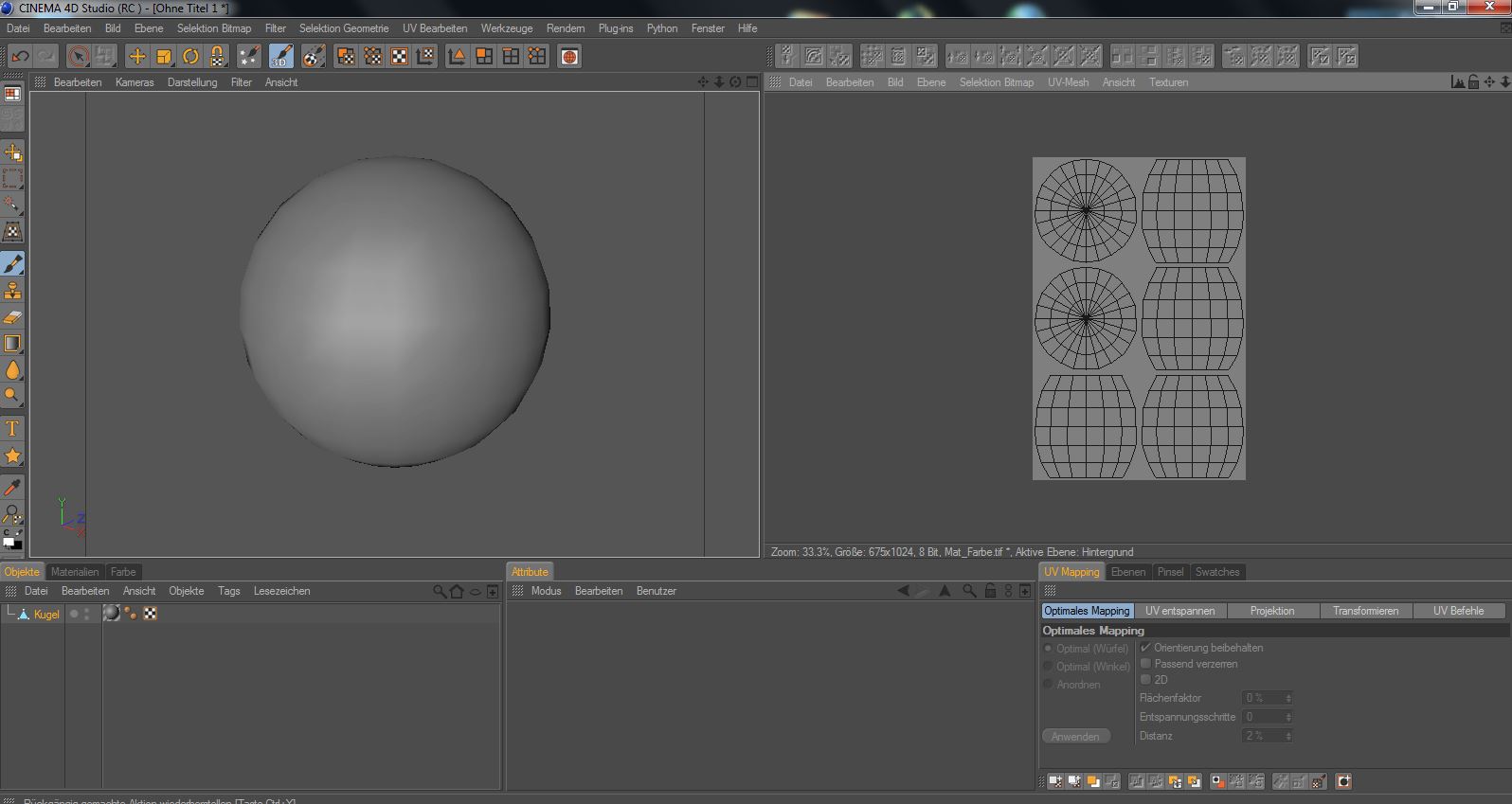 In Bild_1 habe ich eine einfache Kugel erstellt und mit dem Paint Assistent für Bodypaint vorbereitet. Auf der rechten Seite sieht man die UV-Map mit den Polygonen als schwarze Linien.