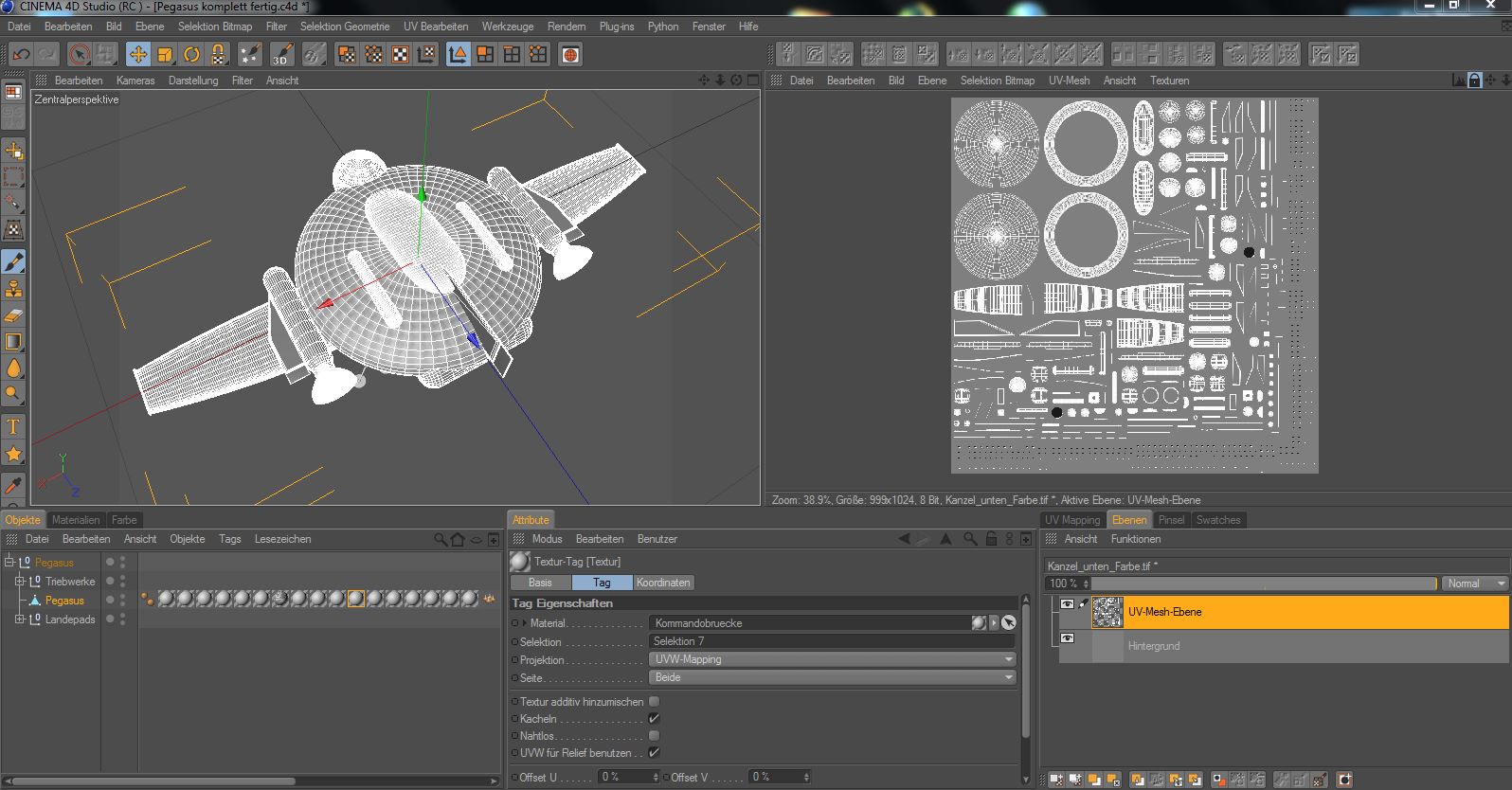 Zumindest hatte ich einen Teilerfolg: Bild_3 zeigt auf der linken Seite das in BP aktivierte Modell Pegasus und sofern man dann auf der rechten Seite nach Ascania die UV-[lexicon]Mesh[/lexicon]-Ebene hinzufügt, kann nun die Textur gespeichert werden, siehe Bild_4. Bisher klappt aber leider nur das Speichern aller Texturen in einer Datei. Ich möchte aber gerne die einzelnen Texturen der Textur-Tags separat speichern.