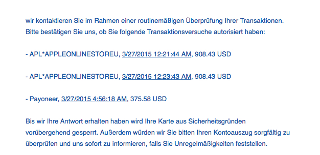 • Diese Info kam leider zu spät. Amerikanische Hotels haben Kreditanfragen gestellt, ein Russe hat sich von meinem Konto Geld überweisen lassen. Die Bank hat zuverlässige Software, um solche Dinge zeitnah festzustellen. Letztes Jahr hatte ich schon einen Mißbrauch und ich habe bei Rendo angefragt. Man war entrüstet, bei ihnen würde es keine Sicherheitsprobleme geben, weil keine Daten gespeichert würden. Ein entscheidener Grund für mich, mit der Einkauferei sehr kurz zu treten. Andererseits; wozu ist sonst eine Kreditkarte da. Jede Tankstelle kann die gesamten Daten erfassen, Vorderseite und Rückseite, sie müssen ja die Unterschrift prüfen und da steht auch die Prüfnummer.