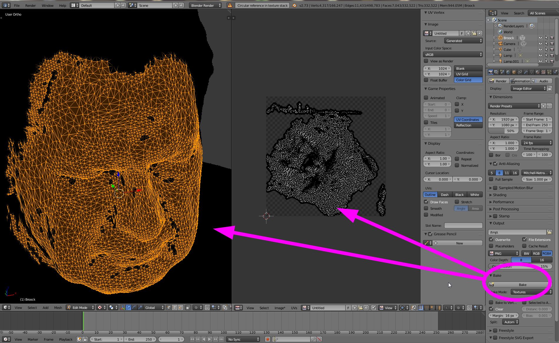 • Ich glaube fast ich mache das verkehrt herum, bei mir wird das ganze Objekt immer schwarz. Auch die Original Textur wird vollkommen scharz nachdem ich auf "Bake" geklickt habe.
