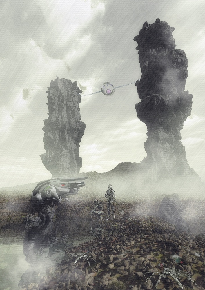 aufgespannt zwischen den Felsen zeigt auf diesem Planeten eine der raren Wasserstellen an.
