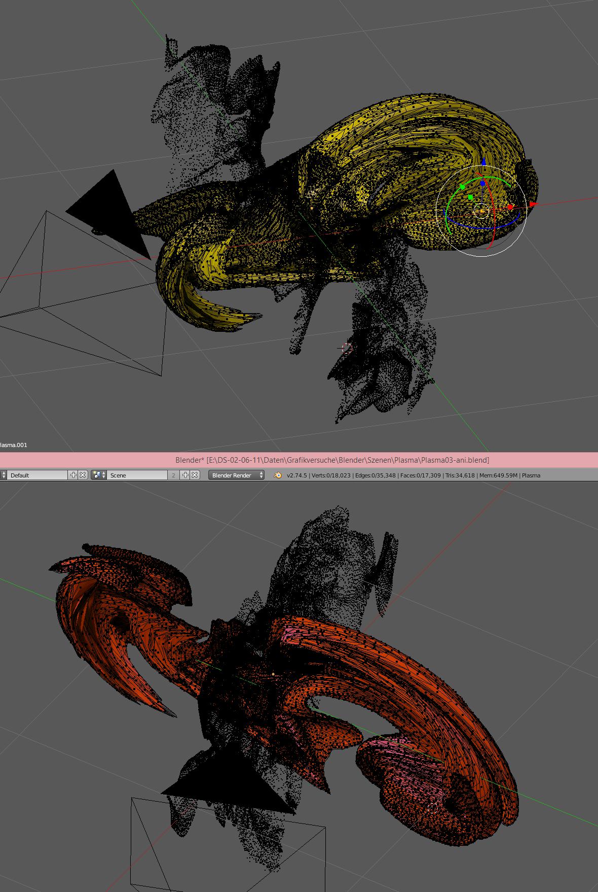 Nachfolgend einige Screenshots, der beiden animerten Objekte im Edit- und Object-Mode, ein Bild aus 4 Plasma-Nebel-Teilen, die ich als Tests gemacht und dann im Compositer von Blender zusammengeführt habe und eine Animation im Flash-Format. Die Animation ist ca.10 Sekunden lang und wurde als Einzelbilder (240 PNGs) gerendert. Renderzeit pro Bild incl. Postproduction ca. 33 Sek.