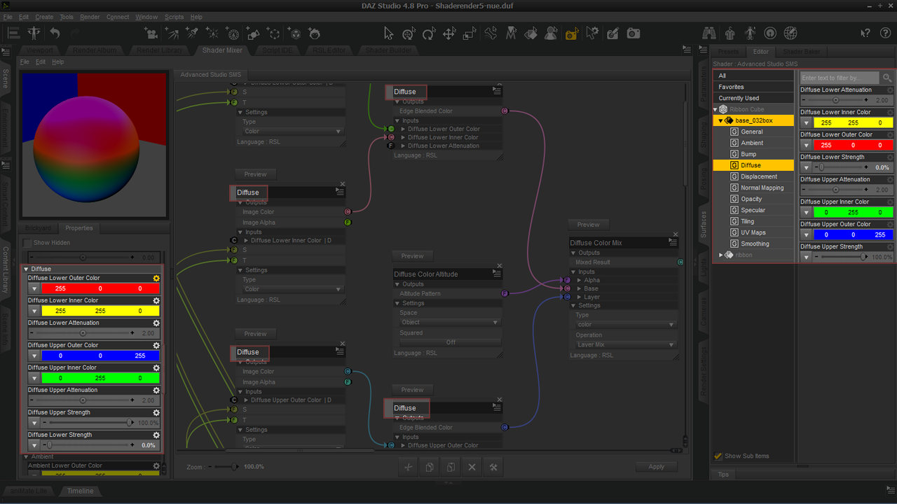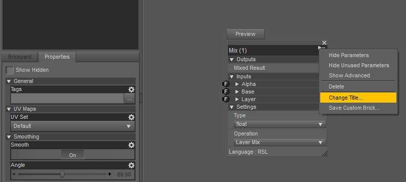 Das funktioniert aber auch nicht immer. Bei komplexeren Shadern und insbesondere, wenn viele Bricks der gleichen Art vorkommen (Mix, Image Map, Binary Operation etc), wird's vereinzelt doch nicht geändert. Habe keinen Schimmer, woran das liegt. Aber ich habe den Eindruck, dass der ShaderMixer in D|S 4.8 ein bisschen besser funktioniert, als in der 4.7er. Meine jetzt, was das Verhalten der Arbeits-Oberfläche betrifft. Vielleicht hat sich dieses 'Namensproblem' ja jetzt auch erledigt. Habe ich bisher noch nicht testen können ...