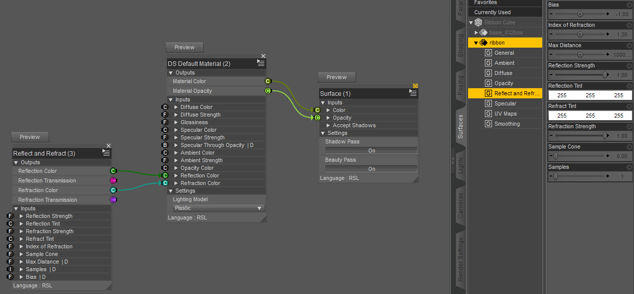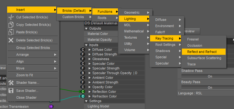 mit dem Reflect and Refract Brick. (s. RefBrickLocation) Dann werden lediglich dessen Color-Outputs mit den Inputs des DS Mats verbunden und die Raytracing Optionen werden im Material verfügbar. (s. SimpleRefRef) -