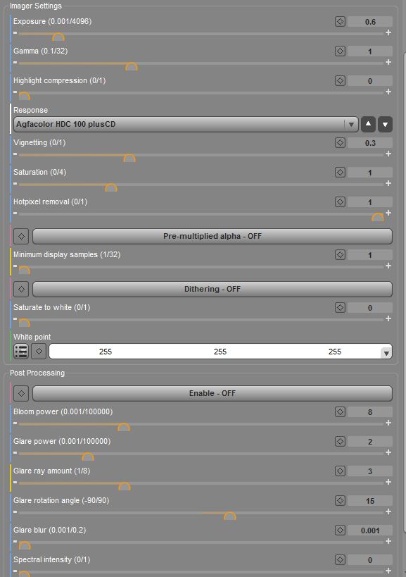 Hab mal angehaengt was man alles an Image Settings bzw. Postprocessing Optionen hat. Das tolle ist halt an den Reglern kann man halt waehrend des Renders rumspielen. Da verbringe ich viel Zeit mit mit.