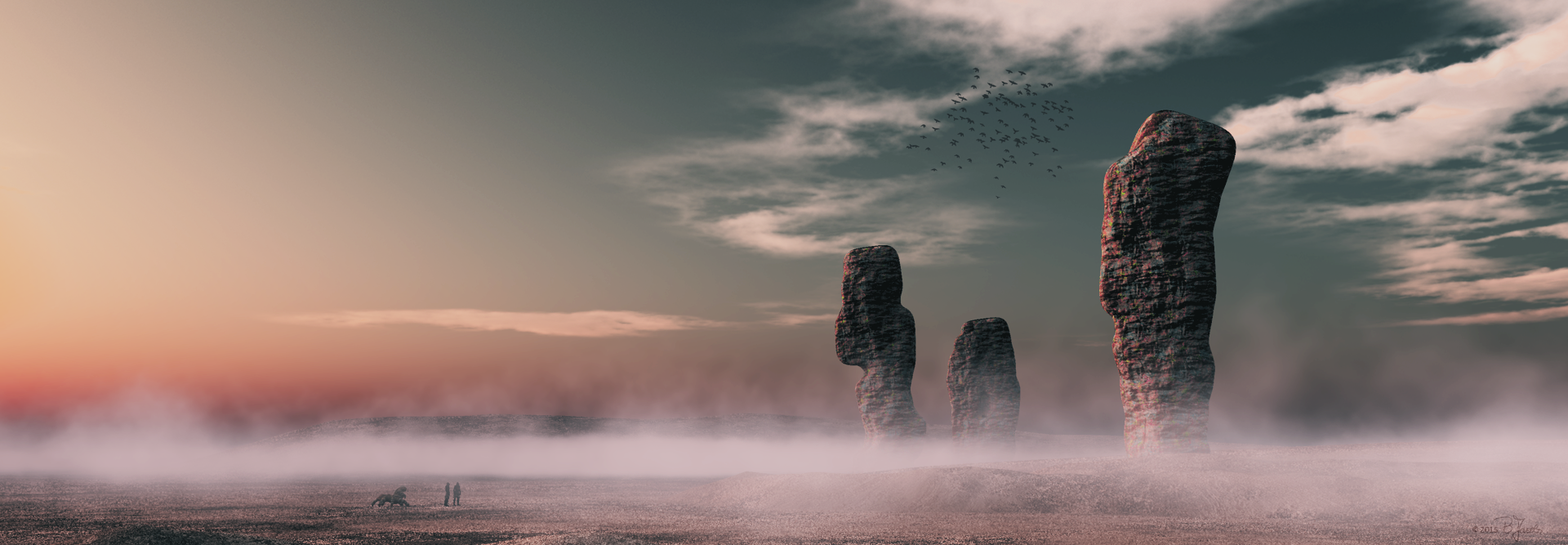 und @Hubby: glossy sind die nicht, die Steine, aber im Orignal beinhaltet das Material verschiedene auch farbige Fotos, deren Farbgebung sich zu Teilen unerwarted verändert (insebsonder im Zusammenhang mit dem ambient light in der Atmosphere in Vue), wenn man die Helligkeit des gesamten Materials sehr hochzieht, was ich getan habe. Das ist der Grund für diese Farbigkeit, die mir aber in diesem speziellen Fall durchaus zugesagt hat, da es eben nicht real aussieht sonder ein wenig "strange"