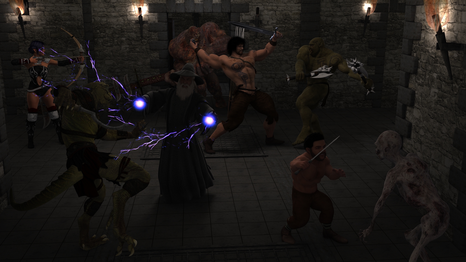 Habe die Archetectural lights http://www.daz3d.com/architectural-lighting-rig genommen für die Ausleuchtung der Szene + jede Torch mit einem Feuer und einem Pointlight versehen.