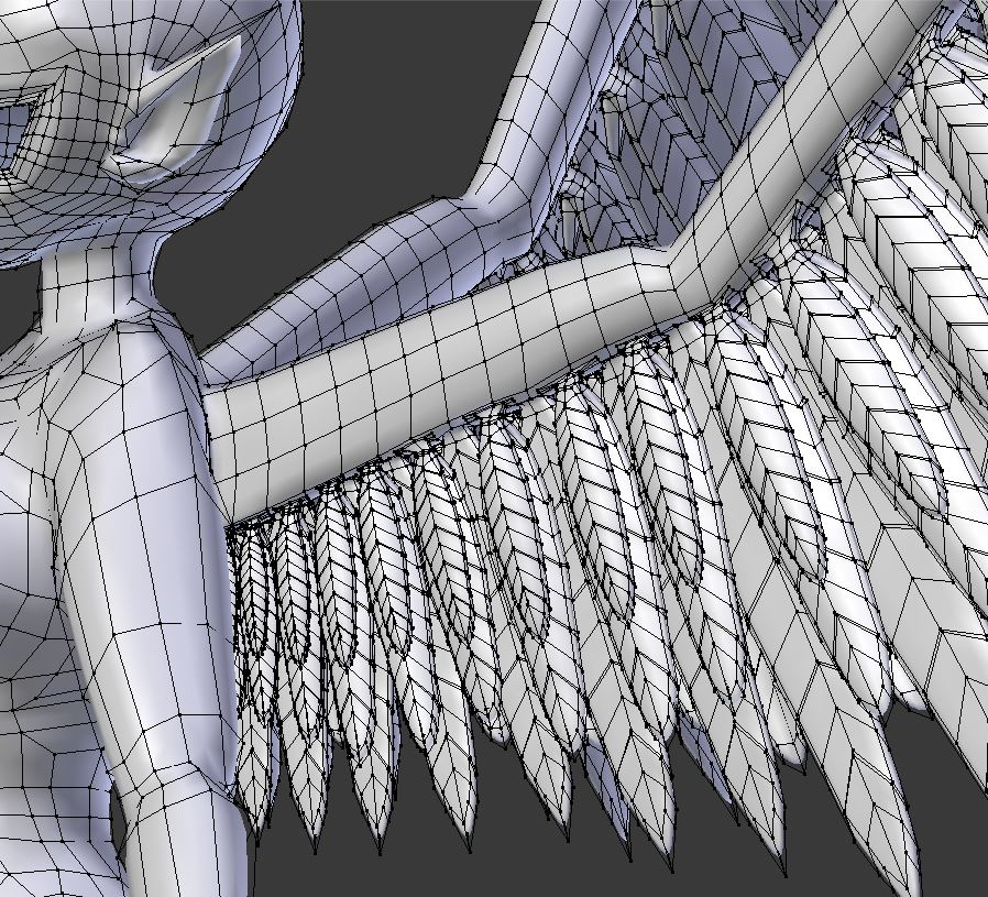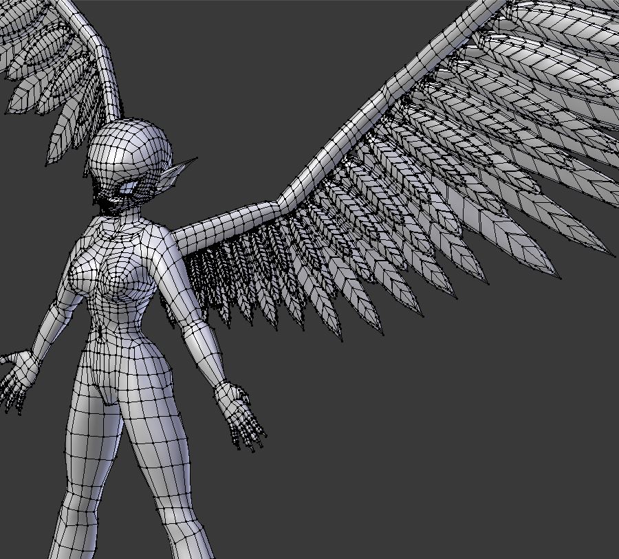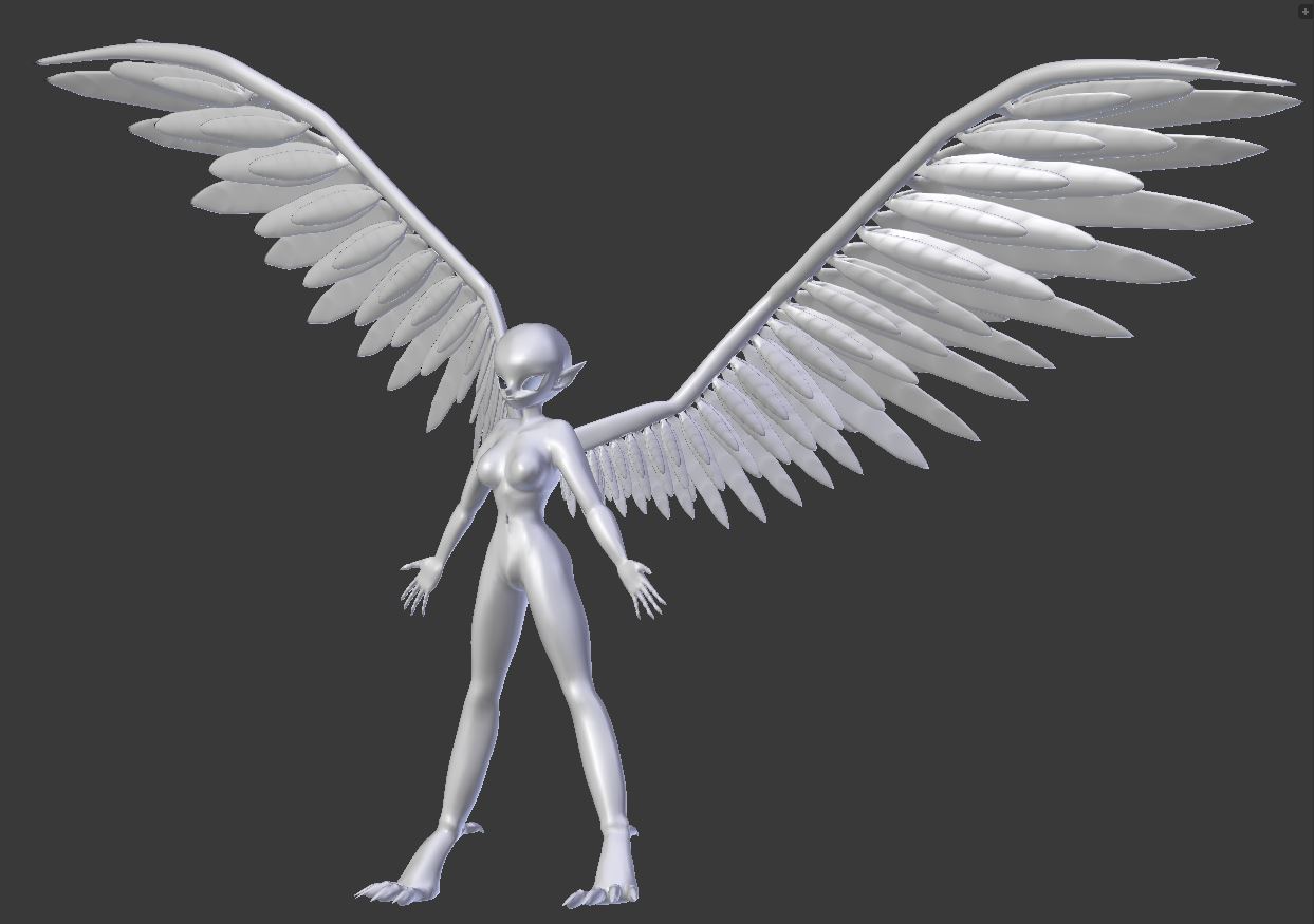 Vor einiger Zeit habe ich mit dem 3D-Modelierung begonnen, war aber von meinem ersten Harpyien-Model nicht zufrieden, worauf ich wieder von Neuem startete. So sieht mein zweiter Versuch aus. Die Flügeln, insbesondere die Federn, gestalteten sich sehr schwierig. Da von dieser Art von Flügeln keine Vorlagen zu finden war, habe ich mich von Vogel-Flügeln insbirieren lassen. Eine einzelne Feder modeliert und so viel Kopiert wie ich brauchte und dann am Flügelarm angebracht, statts nur angelegt. Nun kommt die Retrpology dran und weiß nicht wie bei den Federn vorgehen soll.