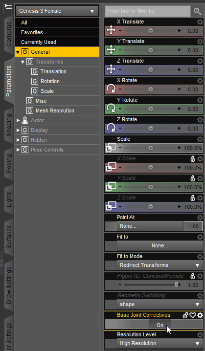 - Herausfinden, ob eine Deformation von den Weightmaps ausgelöst wird oder von den JCMs. G3 hat dafür einen eigenen Button in den Parametern, wo man mit einem Klick alle JCMs ausschalten kann.