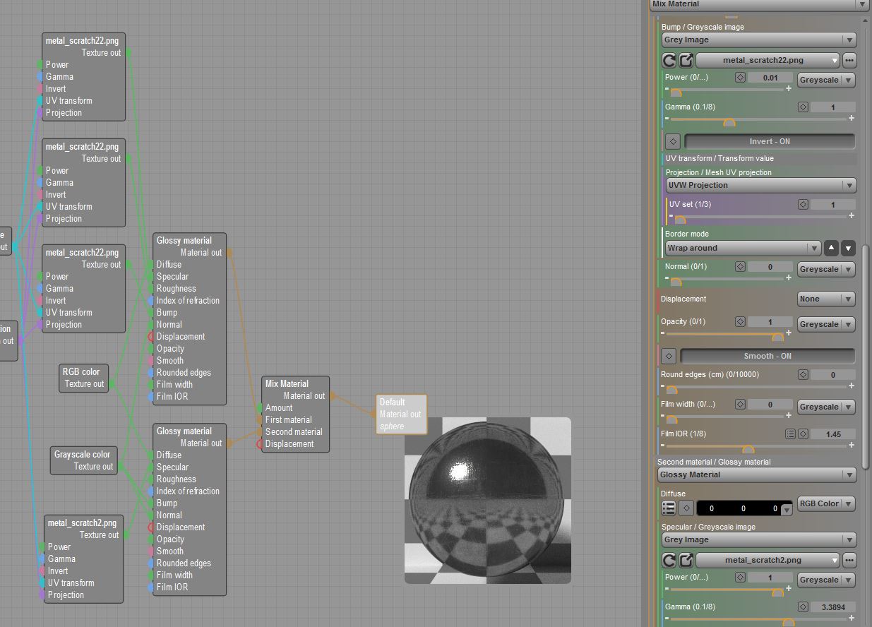 Ich habe mal einen Metallshader geladen und Screenshots gemacht um zu zeigen welche ebenen und optionen in einem sog. Mix Material machbar sind.