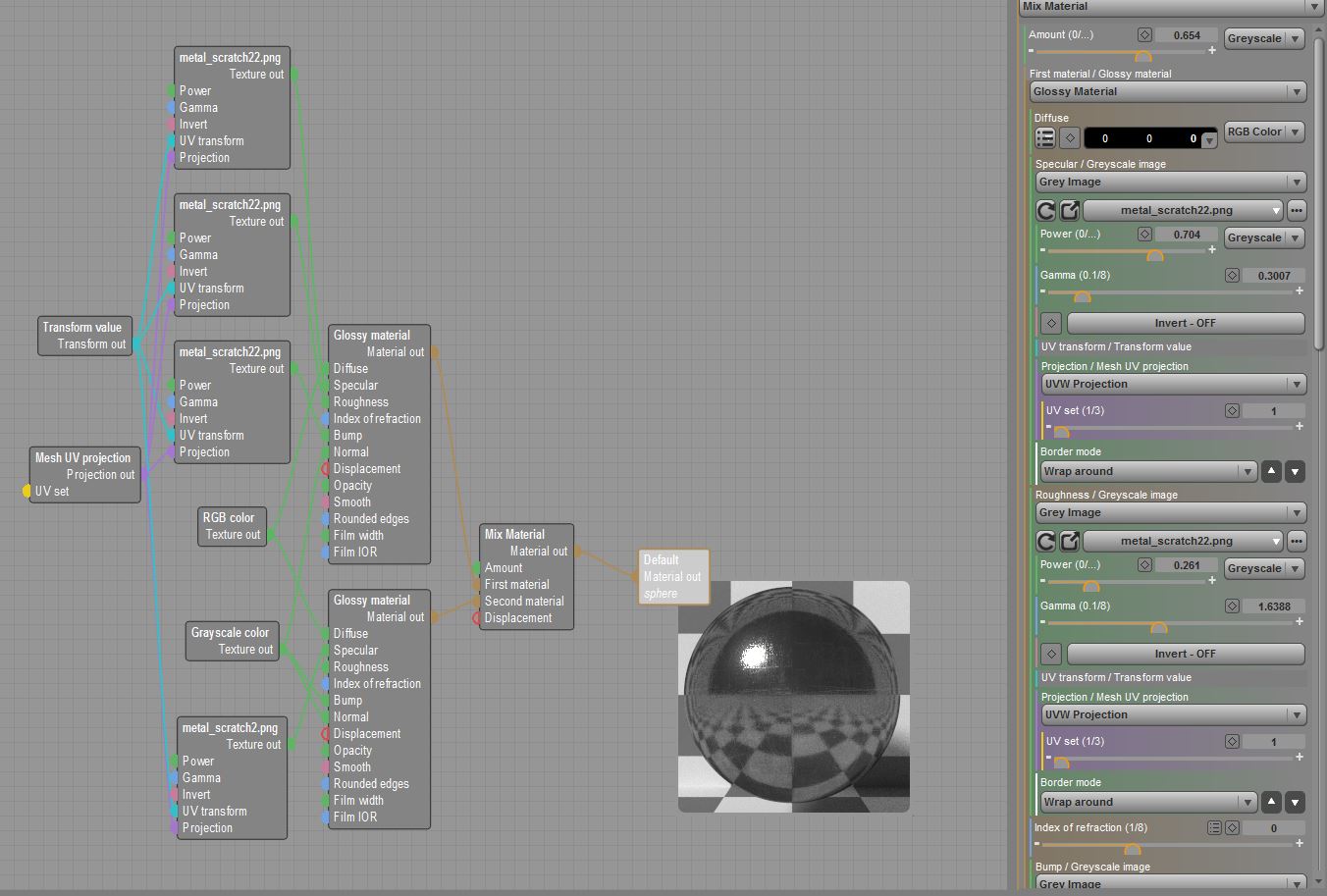 Ich habe mal einen Metallshader geladen und Screenshots gemacht um zu zeigen welche ebenen und optionen in einem sog. Mix Material machbar sind.