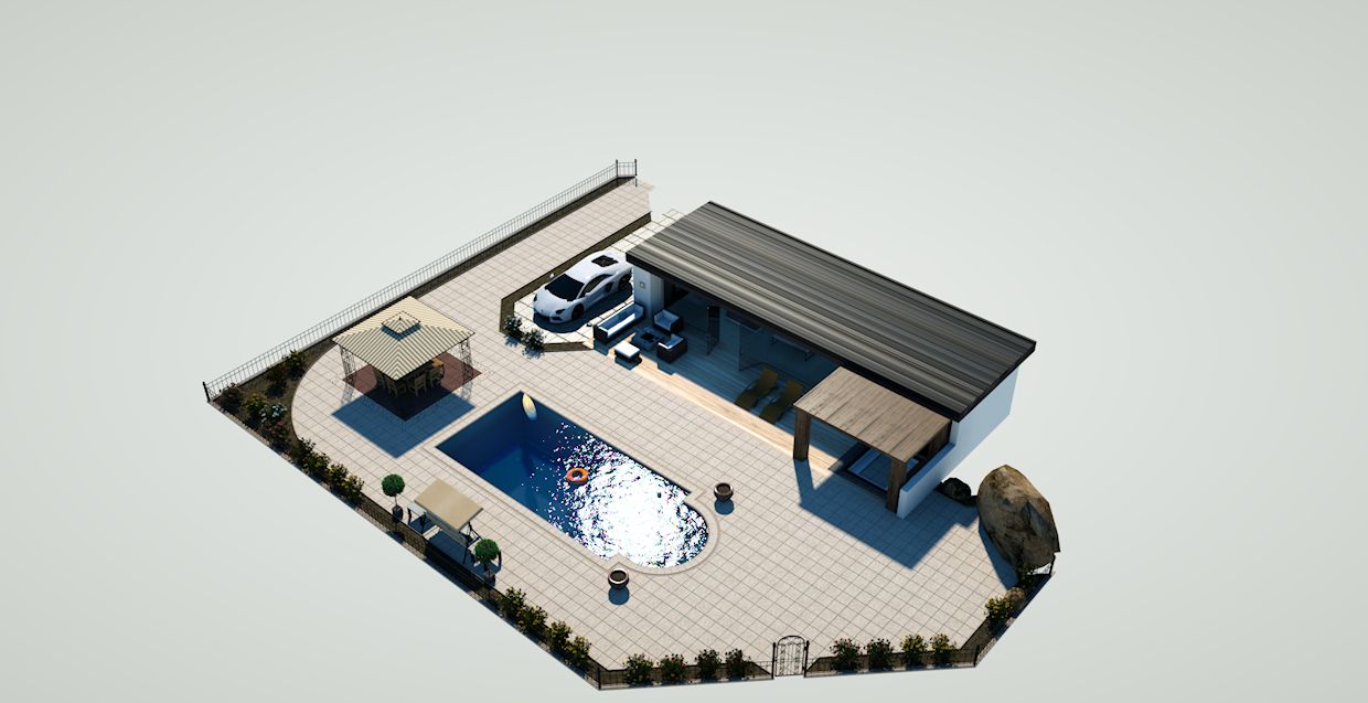 Mir gefallen die Ergebnisse aus Octane, wie auch das intuitive Interface (Datenbank/Listen/Drag and Drop/Node Editor). Dank OC ist bei Texturbearbeitung ein Abstieg in die Tiefen der recht unübersichtlichen Surfaces von DAZ kaum noch nötig. Glas, Wasser, die Blumenpötte und der Lambo sind hier bereits mit Shader aus der Octane Datenbank versehen. Das Ganze geschieht simpel per drag and drop und die Texturen passen auf Anhieb. Manche Maps sind in OC sogar gänzlich überflüssig. Die leicht unruhige Wasseroberfläche z.B. hat weder eine Bump noch eine Diplacement Map - was ja ansonsten erforderlich wäre.