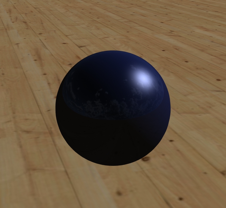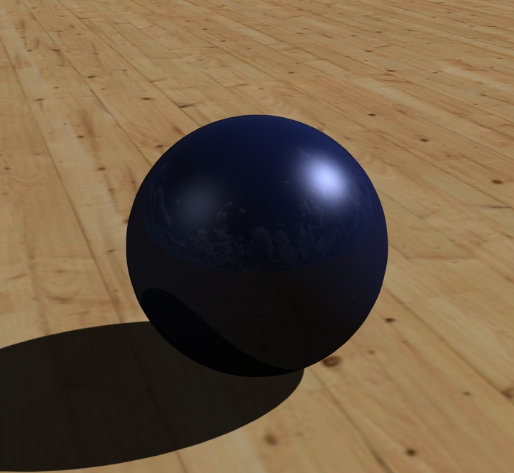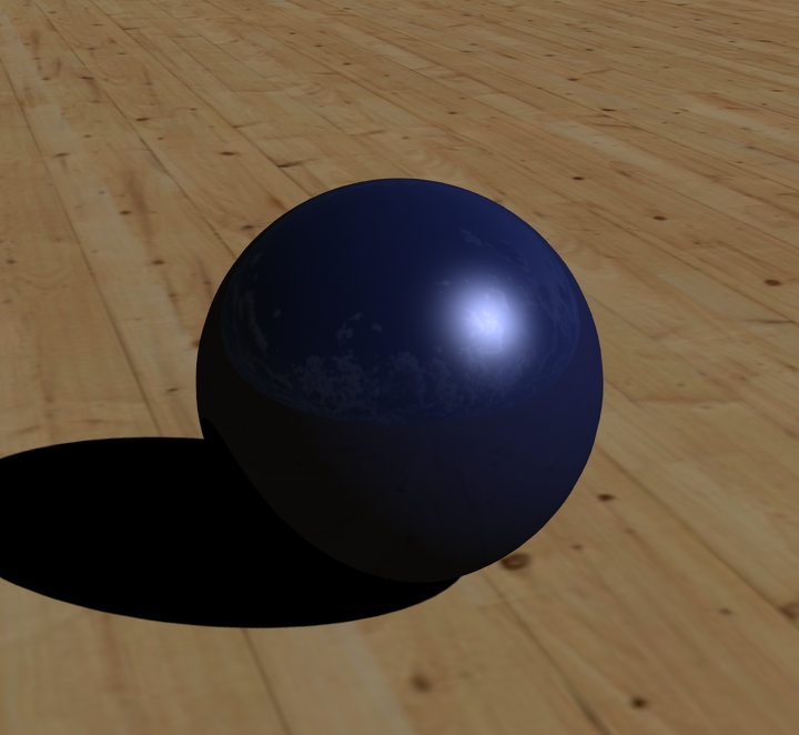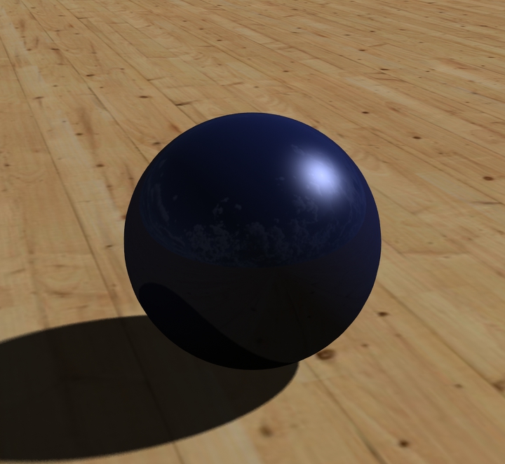 Meine Kugel hat aktuell diese Einstellungen. Verändert sind nur Diffuse (blau), Specular (Glanzpunkt Stärke und Farbe), Glossiness (Glanzpunkt Größe), sowie die leichte Spiegelung (Reflection 10%).