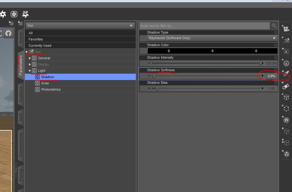 Schatten entschärfen? Nichts leichter als DAZ 8) DistantLight 1 (Sun) ist der Verursacher, also dort die Schatten-Weichheit auf 2% stellen...