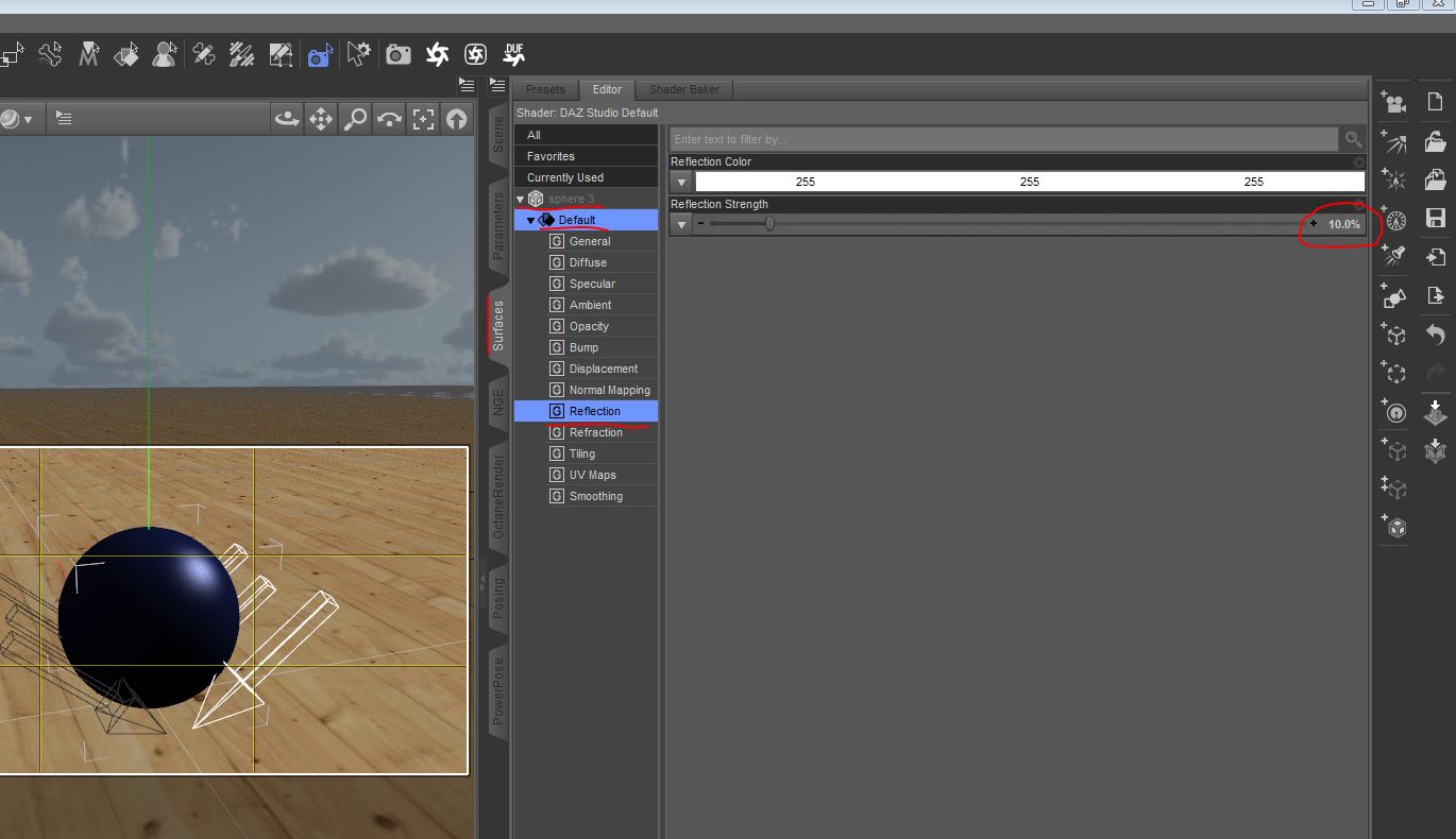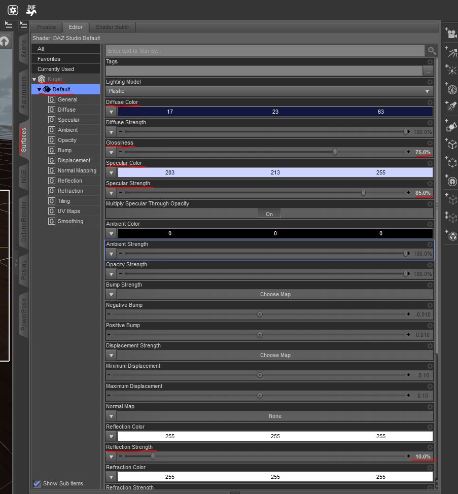 Dieser Testraum ist aber auch perfekt geeignet um sich mit den vielen Objekt Manipulationsmöglichkeiten in DAZ vertraut zu machen. Vielleicht sieht Eure Kugel ja doch noch nicht so aus wie meine. Dann markiert die Kugel im Scene Tab und geht dann in die Surfaces der Kugel. Die wichtigsten und immer wiederkehrenden Verstellungen, mit denen Ihr in DAZ zu tun haben werdet, sind Diffuse, Specular, Glossiness, Opacity, Ambient, Reflection, als Basis. Es gibt unendlich viele mehr. Aber befasst Euch nicht mit SSS Shadern, solange Ihr diese hier in ihrer Wirkungsweise nicht verstanden habt.