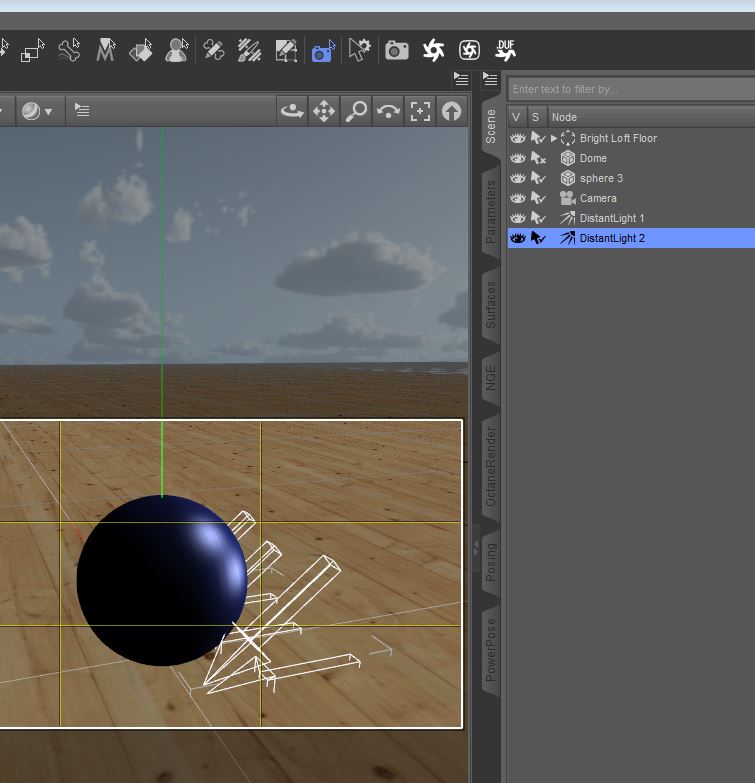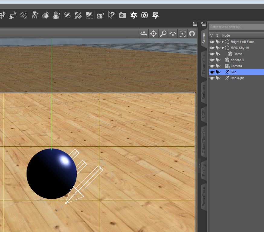 Nehmt Euch irgend eine Szene und entfernt (falls vorhanden) das mitgelieferte Licht (im Scene Tab löschen). Oder, wie ich hier, platziert einen Boden (DAZ Primitive/Plane) in der Szene, legt eine Kugel (DAZ Primitive/Sphere) darauf und setzt einen Skydome darüber. Ein Skydome hat den Vorteil, dass Ihr keine Szene braucht, z.B. für Reflektionen. Denn wo keine Szene ist, kann auch nichts reflektiert werden (s.o.). Skydome, Boden und Kugel reicht dann. Und platziert eine Kamera in der Szene, deren Blickwinkel (POF) Ihr die ganze Zeit über nicht verändern solltet, damit Ihr die lichttechnischen Veränderungen verfolgen könnt. Wenn Ihr Euch in der Szene bewegen wollt, nehmt Ihr den Perspective View oder eine 2. Kamera. Und gebt der Kugel eine Farbe (DAZ/Surfaces/Editor/Diffuse). Wenn Ihr das was jetzt kommt, ein par mal gemacht und verstanden habt, braucht Ihr dafür - und jedes andere Lichtsetting - zukünftig keine 3 Minuten.